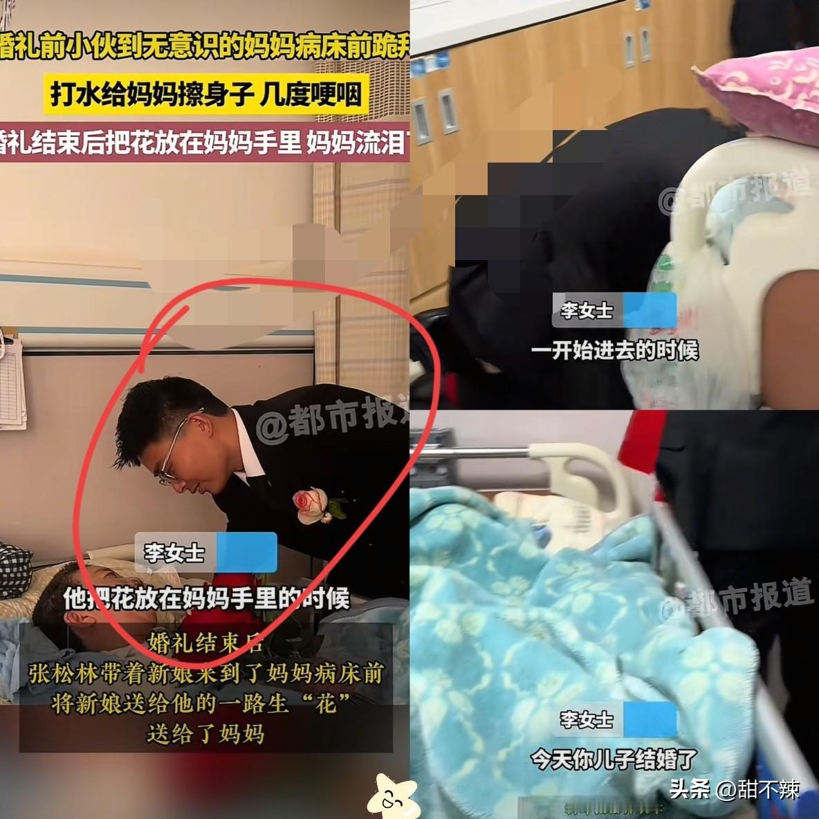 泪目!河南一男子今天结婚,一大早打扮得帅帅气气的,却没先去接新娘,反倒第一时间冲到了医院,对着昏迷多年、毫无回应的妈妈,他双膝跪地,凑到耳边轻声喊:“妈,我今天结婚啦,你看看我帅不帅?” 他絮絮叨叨说着成家的心愿,仔仔细细给妈妈擦身、安顿好一切,才匆匆赶去接新娘! 婚礼一结束,又马不停蹄跑回医院,把新娘花轻轻放在妈妈床头! 没想到下一秒,妈妈眼角竟缓缓滑下泪水! 都说久病床前无孝子,可他用年复一年的陪伴证明,孝心从不是一时的感动,而是刻在骨子里的担当! 妈妈或许说不出话,但儿子的声音、这份牵挂,她一定都懂! 一个对母亲如此温柔有责任的人,对婚姻也必然赤诚专一。 新娘嫁对了人,这份孝心比任何彩礼都珍贵! 真正的帅,从来不是皮囊,而是刻在骨子里的善良与担当!