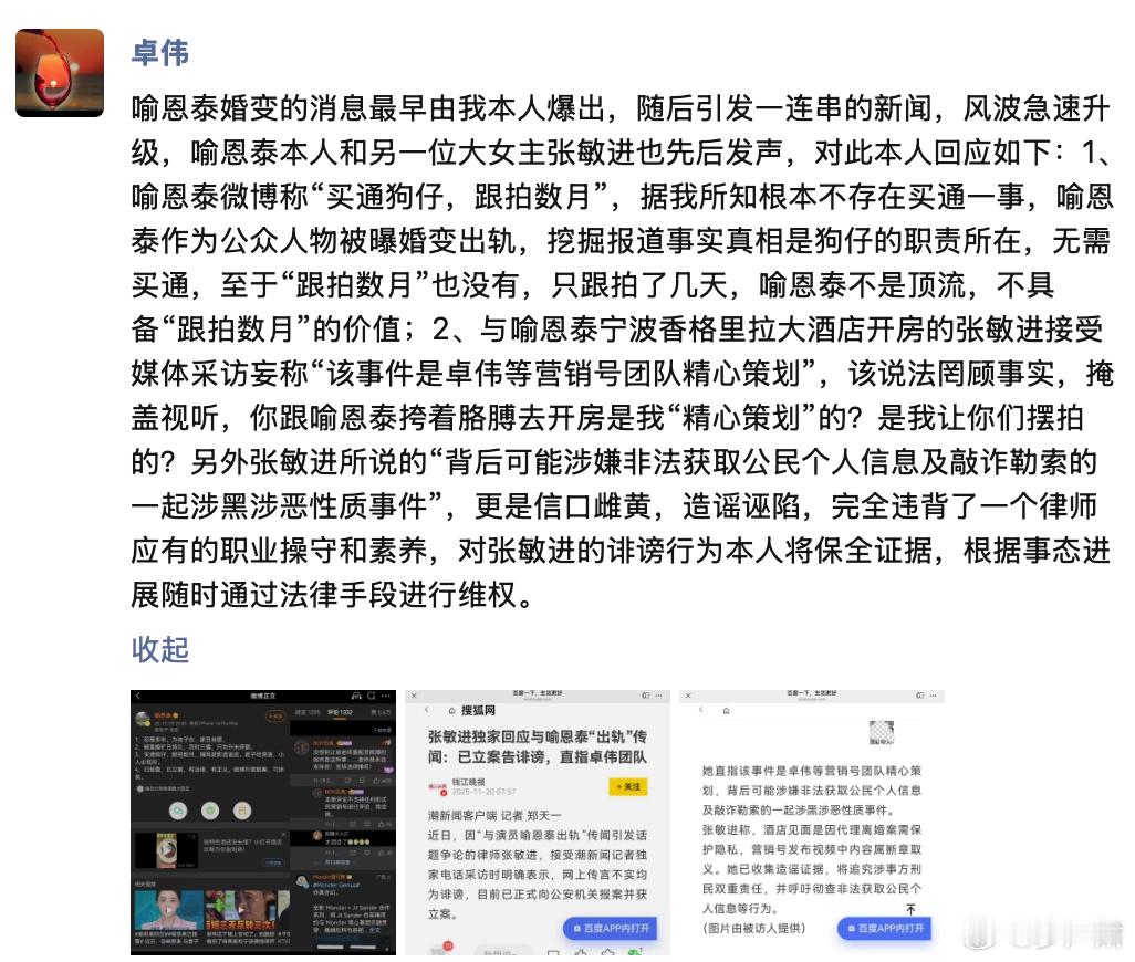 最新进展:1.有网友投稿喻恩泰2017年就在ktv唱歌亲吻献花女子,喻恩泰2015年结婚,昨日微博中曾说自己为了孩子忍辱多年。2.卓伟坚决否认有狗仔被收买跟拍喻恩泰几个月:“只跟拍了几天,喻恩泰不是顶流,不具备「跟拍数月」的价值。”喊话喻恩泰女伴:“你跟喻恩泰挎着胳膊去开房是我「精心策划」的?是我让你们摆拍的?”