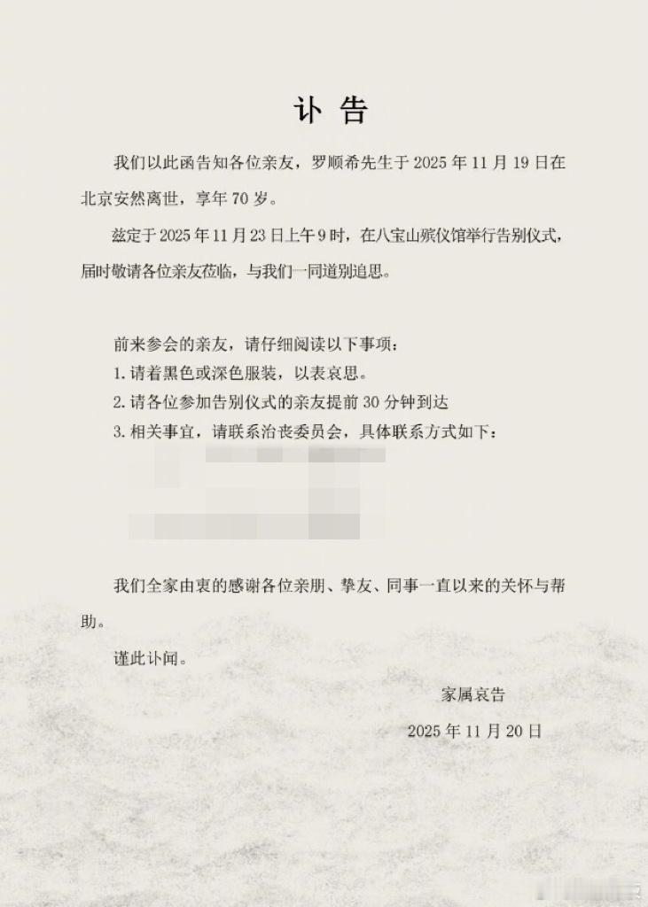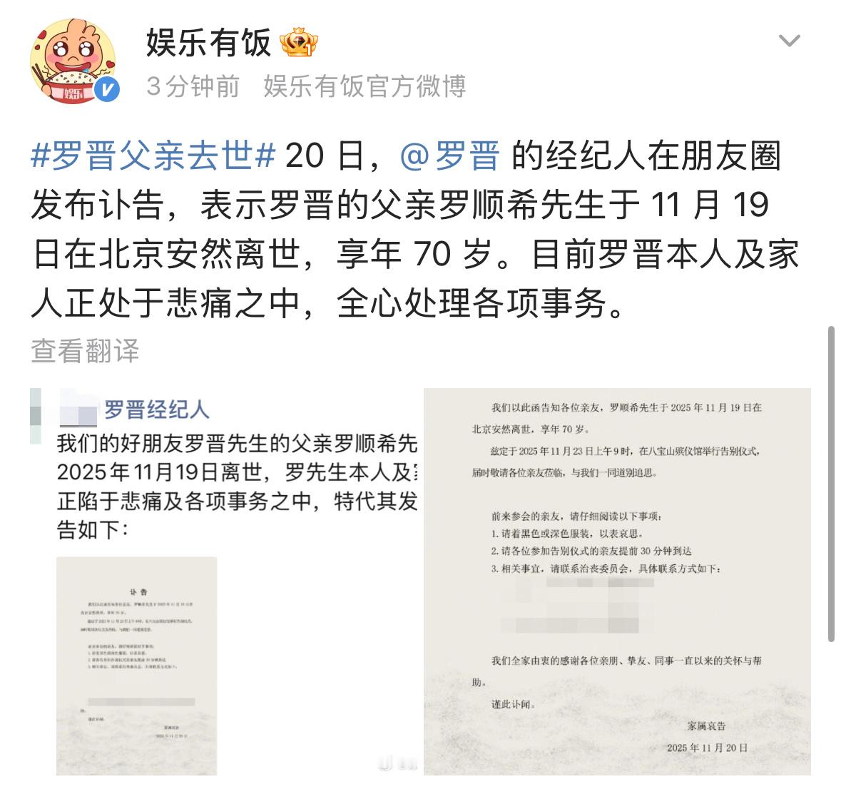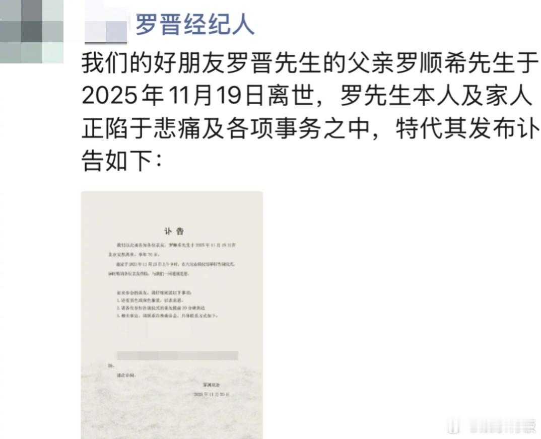娱乐圈突传噩耗,知名演员罗晋的父亲去世!罗晋经纪人于11月20日在朋友圈代发讣