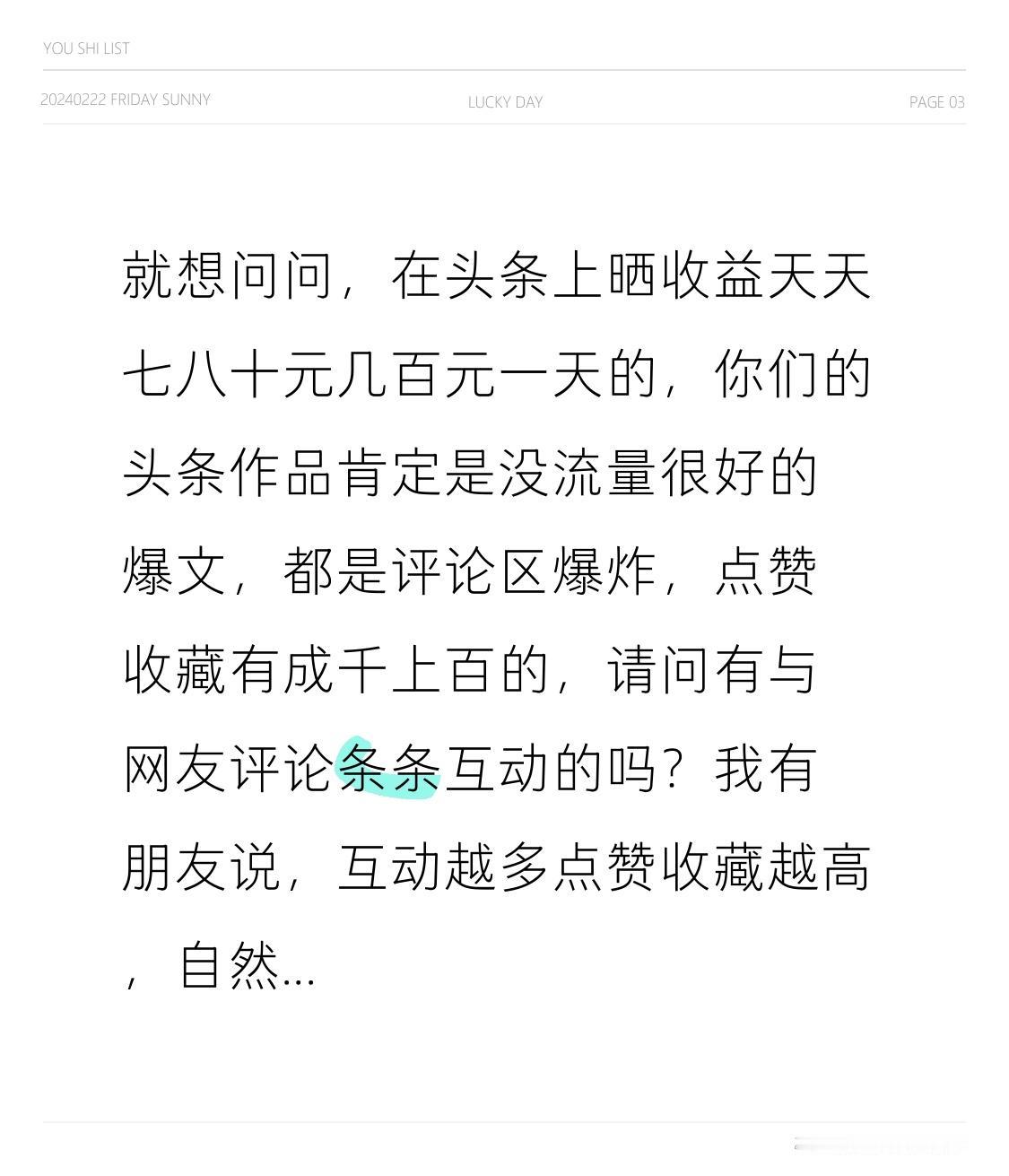 就想问问,在头条上晒收益天天七八十元几百元一天的,你们的头条作品肯定是 流量很好的爆文,都是评论区爆炸,点赞收藏有成千上百的,请问有与网友评论条条互动的吗? 我有朋友说,互动越多点赞收藏越高,自然对收益也会水涨船高的。 但我发现我的可不是,现在我都极少互动了,因为我发现我的互动与不互动,其收益也差不了什么的!
