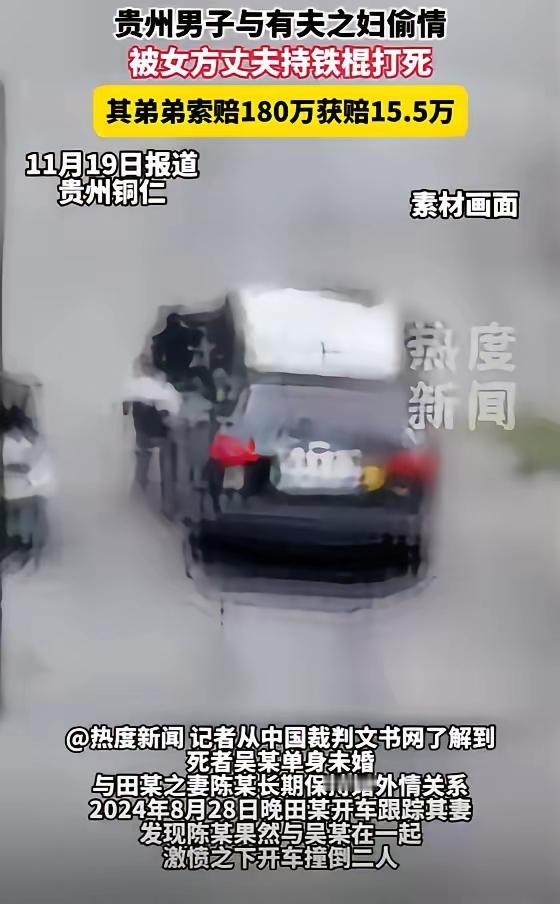 自古奸情出人命,这色字头上一把刀,贵州男子和有夫之妇偷情,被女方丈夫拿着铁棍打死了,所以,不要碰有夫之妇,搞不好会丢了性命! 事情发生在贵州铜仁。 贵州有一名单身未婚男子吴某,总喜欢和有老公的陈某微信里聊天。 这聊着聊着,两人就有了肌肤之亲。 他们俩有了婚外情,吴某成了陈某的情人。 陈某老公天天在外打工,没有发现妻子的不对劲。 直到风言风语传到陈某老公耳朵里,他才发现妻子的不对劲。 原来,陈某和吴某个的情人关系,不是一天两天了,他们的关系一直不断,已经好几年。 直到有一天,陈某老公盯梢了自己的妻子。 他开车跟踪这俩人。 直到撞击他们俩的奸情,发现果然有情况。 陈某老公激愤之下,开车撞到了他们俩,然后用铁棍把二人打伤。 没想到,这个陈某老公下手真狠,造成了吴某死亡,陈某轻伤的结果。 吴某死了,陈某轻伤,陈某老公被拘留。 因为这个事情,吴某的弟弟提起了180万的诉讼赔偿要求,经过法院审理,支持了15.5万。 因为陈某的婚外情,造成了两个家庭出事。 吴某属于单身未婚,肯定有父母。 陈某有老公 有孩子。 现在,因为陈某没有守住婚姻家庭的底线,丧失了道德底线,做出对不起老公的事情。 因为她的婚外情,引发了这一场祸事。 情人因为她丧命,丈夫因为她坐牢。 不知道她将来怎样面对自己的孩子,和双方的父母。 本来好好的幸福家庭,因为他们的出轨,妻离子散,家破人亡。 说成年人的道德底线,第一要遵守婚姻法则,管好自己的下半身呢! 杨绛先生最深刻的一段话:“不要去碰一个已婚的女人,她是一个男人的脸面; 不要去碰一个已婚的男人,他是一个女人的余生。 不是你的女人,不要嘘寒问暖; 不是你的男人不要情意绵绵。 这是为人之其本,男女之间的底线。” 婚姻法则就是忠诚和担当。