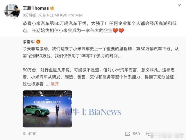 【风雨兼程!今日,小米第50万辆新车下线,雷军感慨“意义非凡”】今天,小米汽车第50万辆汽车下线!雷军感慨:今天非常激动,我们迎来了小米汽车史上一个重要的里程碑:第50万辆汽车下线。从第1台到50万台,我们仅仅用了1年零7个多月的时间。50万台,对行业巨头来说,可能微不足道;但对小米汽车而言,意义非凡。这标志着,小米汽车从研发、制造、销售、交付和服务等整个体系能力,得到了充分验证!