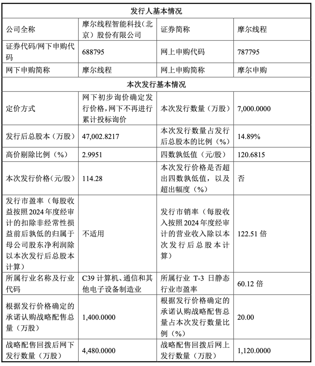 摩尔线程11月20日晚间公告,首次公开发行股票并在科创板上市,发行股份数量为7000万股,全部为公开发行新股。本次网上发行与网下发行将于2025年11月24日(T日)分别通过上交所交易系统和互联网交易平台实施。