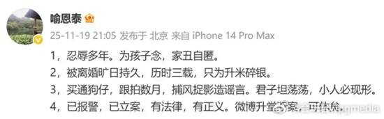 "吕秀才"喻恩泰回应离婚风波 为孩子忍辱多年已报警11月19日晚,演员喻恩泰在其个人社媒发文回应近期离婚风波。此前据上游新闻报道:近日,“卓伟曝喻恩泰婚变内幕”相关词条登上热搜,称喻恩泰与妻子史林子已分居2-3年,其离婚诉讼已第二次于北京开庭。喻恩泰此前曾说自己是不婚主义,却对妻子一见钟情。记者查询天眼查信息显示,喻恩泰名下关联2家企业,仅北京火天泰有商贸中心为开业状态,喻恩泰为该企业的经营者。查关系信息显示,喻恩泰与妻子史林子无商业关联。据悉,喻恩泰是《武林外传》中满腹经纶的吕秀才,也是现实中名副其实的学霸博士,2025年开年,喻恩泰参演的《致1999年的自己》和主演的《雁回时》接连播出,这位“学霸明星”再度引发关注。