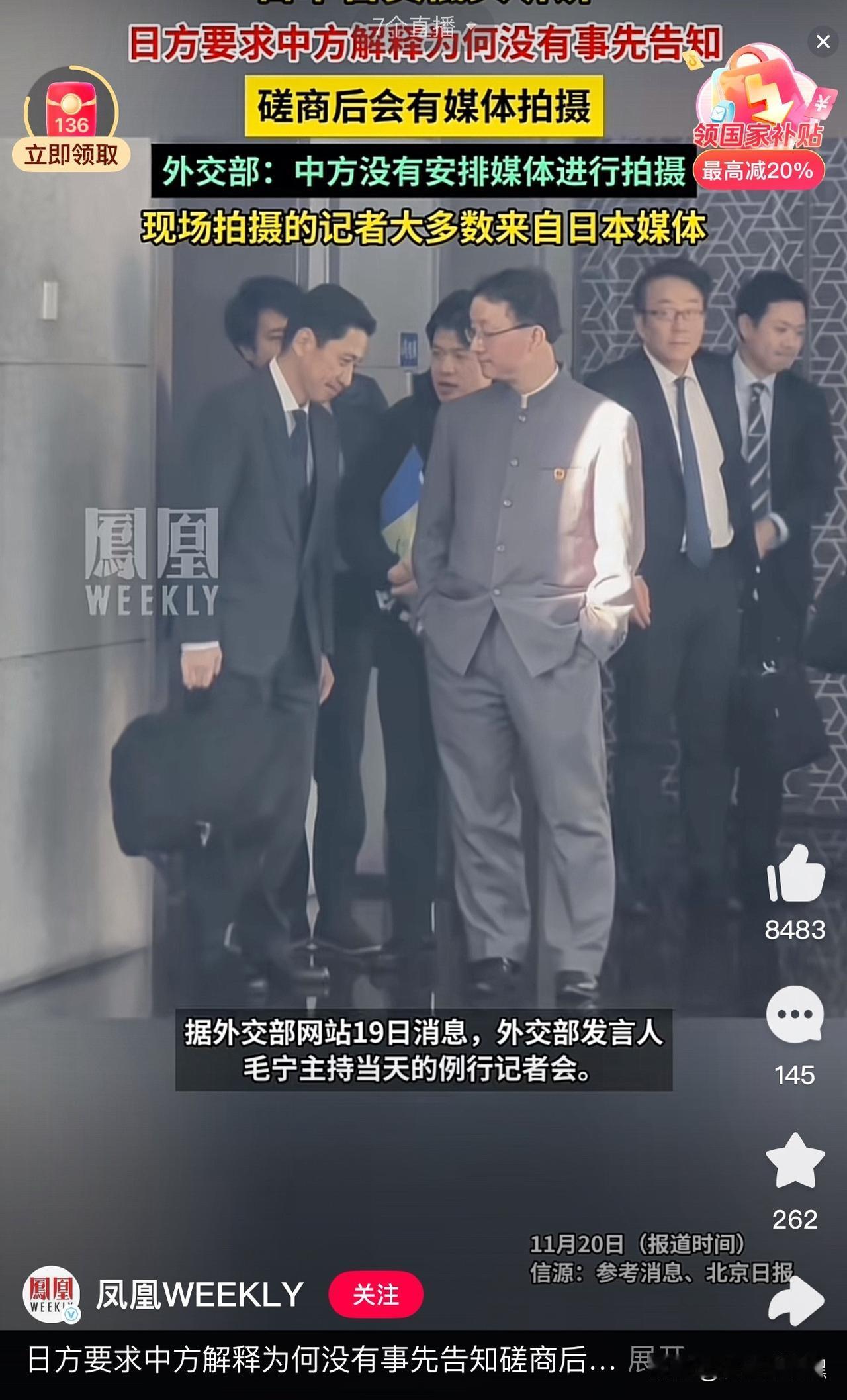 偷鸡不成蚀把米 日本大洋洲局长金井正彰与中国外交部亚洲司司长刘劲松磋商后走出外交部,大批的日本记者想拍下双方握手的镜头,以讽刺中国服软的镜头。 可以千算万算,刘司长自有定算,双手插兜,气定神闲,根本不给他们机会,正所谓,中国有句古话,让你没地儿下蛆! 日本当局一计不成,又生一计,竟然质疑我外交部,为何没有通知磋商后有媒体拍摄。中国外交部轻蔑的回答,我们根本就没安排,那些记者都是你们日本媒体。 得,又是偷鸡不成蚀把米,这无赖的行径倒真是玩的轻车熟路啊 ————————