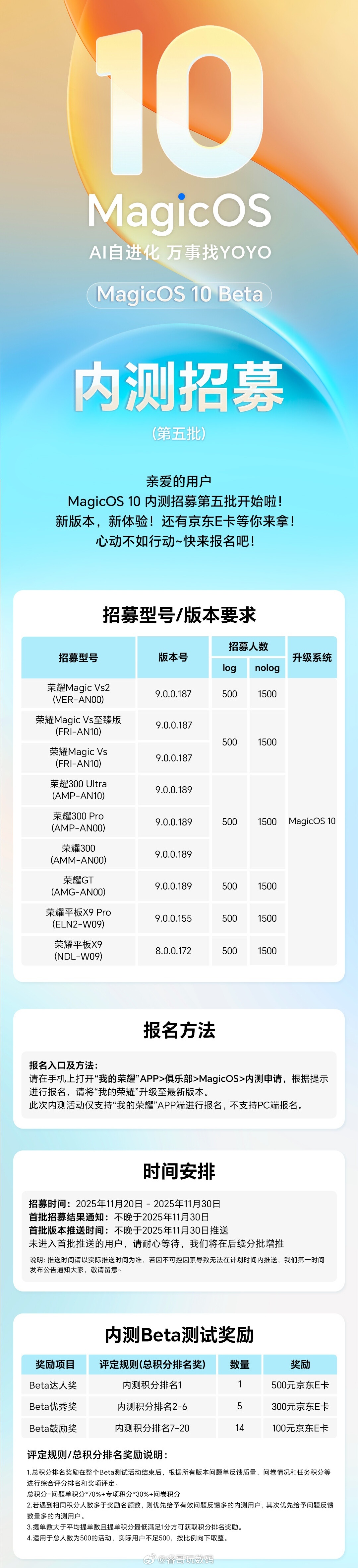 荣耀 第五批机型内测招募,本期招募荣耀Magic Vs2、荣耀Magic Vs、荣耀300系列、荣耀GT、荣耀平板X9、荣耀平板X9 Pro,有这些设备的朋友可以通过我的荣耀APP-左下角俱乐部频道-MagicOS-内测报名升级体验。