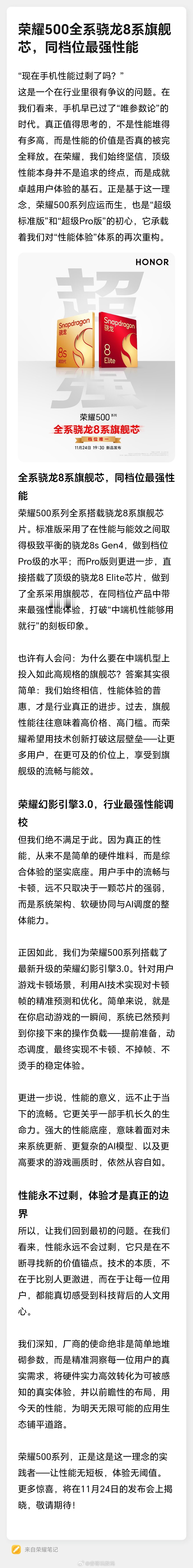 性能强是体验好的基础, 系列即使是中端机,性能和影像能力也绝不妥协,全系搭载骁龙8系旗舰芯 + 荣耀幻影引擎3.0,行业最强性能调校,让性能无短板、体验无阈值!