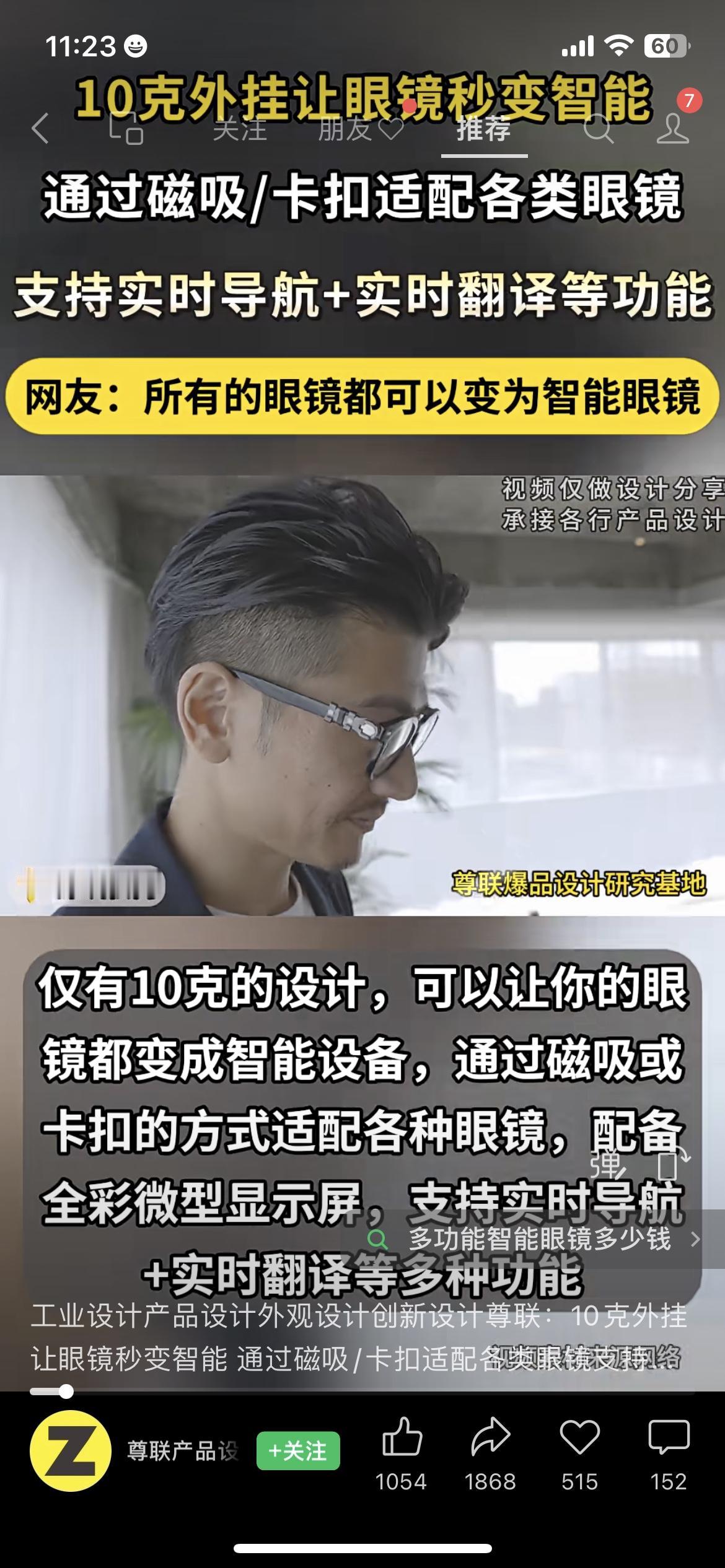刚刷到深圳一个设计团队的作品,直接戳中戴镜党痛点!10克的小外挂,往眼镜腿上一吸/一卡,普通眼镜就能变智能眼镜! 不用换眼镜真的太香了——我这副近视镜花了一千多,一直馋智能功能但舍不得换,这设计刚好解决了。才10克,比2枚硬币还轻,挂耳朵上基本没负担,近视镜、墨镜都能适配。 功能也全是刚需:全彩小屏能实时导航(走路不用掏手机)、实时翻译(出国聊天直接出字幕),看团队展示的效果还挺丝滑~ 不过目前还在设计阶段,没量产呢!你们觉得这思路靠谱不?要是真做出来,你们会愿意试试吗?评论区聊聊!