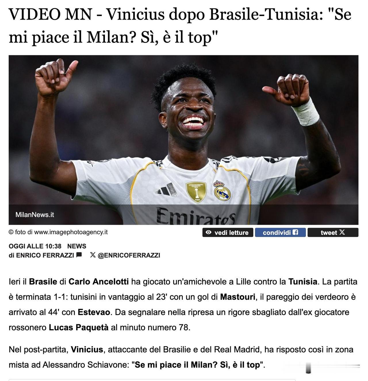 皇家马德里俱乐部巴西边锋威尼修斯接受采访表示他很喜欢米兰,米兰是一家顶级俱乐部。不用过度解读这句话,意大利国家队比赛结束,你问里奇喜欢皇家马德里不,里奇肯定会做出相同的回答,最基本的人情世故。我不认为这是威尼修斯在向米兰示好,不用说年薪,年龄根本都不到。 但威尼修斯后面说的话绝对不是客套,他说安切洛蒂是一位十分出色的教练,他为我们带来了不一样的足球体验,他是真正的冠军教练,无论在皇家马德里俱乐部还是现在的巴西国家队安切洛蒂都会与我们讲述他踢球和做教练时候的经历,他会不自觉的为我们分享米兰俱乐部的点点滴滴,这样的分享很难让我们对米兰没有认识。 米兰一直都有巴西球员当家的传统,就好像国际米兰有阿根廷球员加成一样,加盟米兰的巴西球员很少有不成功的,但最近几年咱们引进的球员质量是越来越差,希望安切洛蒂能在巴西国家队多干几年,好好为巴西球员讲讲米兰,就好像之前的那个拉杨一样,拉杨就是听安切洛蒂的建议才愿意加盟米兰的,但最后不知道转会为啥没谈成。