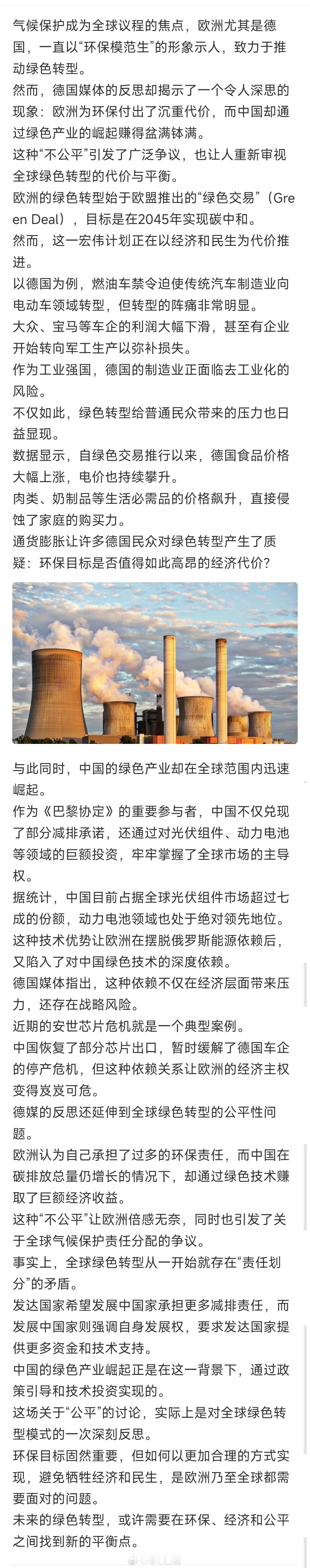 德媒:欧洲为环保付尽了代价,中国却在闷声发大财,这太不公平了。⭐德国这是在跟中国比种树多还是比可再生能源利用的好?你制定的规则,结果你打不过,你开始喊不公平?