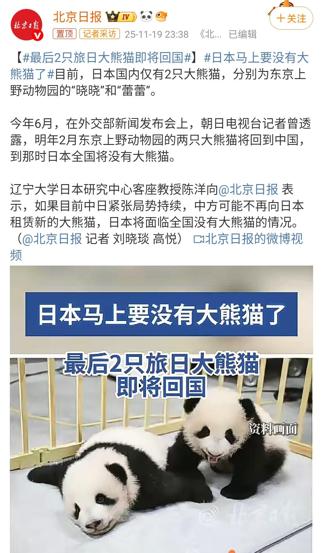 日本马上没有大熊猫了!原因是我们不借给他们了,明年两只大熊猫的旅日日期就要到了,届时就将回国! 现在已经不再免费为世界其他国家提供大熊猫的,而是采用了类似服务措施,相关国家要建设设施规模完备的大熊猫场馆,然后从中国这里租借大熊猫规定多少年之后大熊猫返回。 包括在其他国家出生的大熊猫到期之后也要返回祖国。各位是怎么看的?欢迎评论区留言。