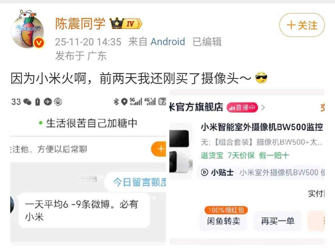 陈震回应为什么一天发的微博6~9条必有小米! 陈震表示小米火呀,前两天自己还刚买了小米的摄像头。 只要提小米,陈震就有相关的流量,所以干脆就天天提。另一个大家也非常习惯刷到小米各种新闻或者资讯。 各位是怎么看的?欢迎评论区留言。