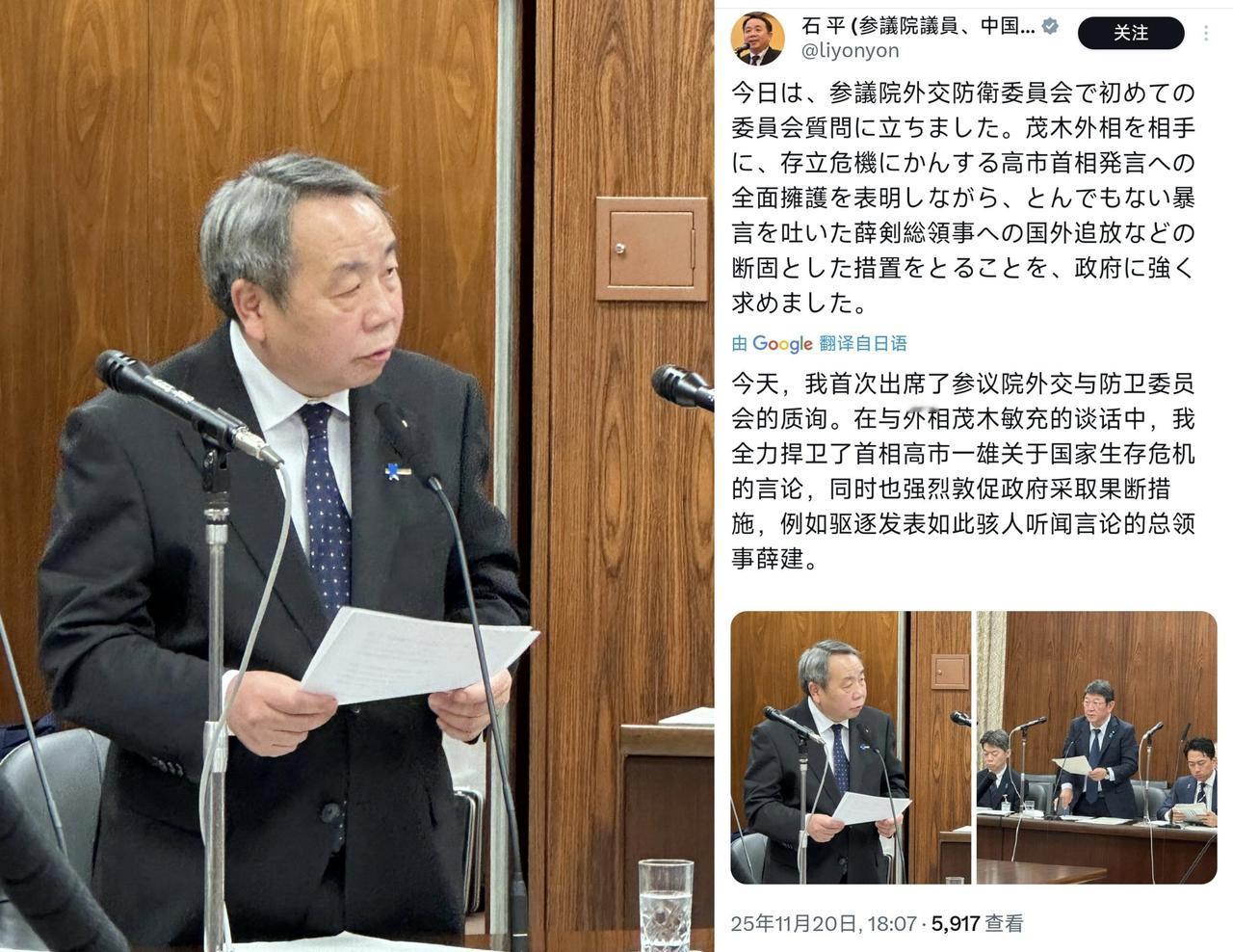 民族败类、跳梁小丑 日本维新会参议员石平发文写道! 11月20号,有个叫石平的华人火了——但不是什么好事,是因为他干的缺德事让人骂声一片。 作为日本维新会的参议员,他当天在社交平台发文,说自己第一次参加了日本参议院外交与防卫委员会的质询,跟日本外相茂木敏充聊的时候,不光使劲帮日本首相高市早苗的“国家生存危机”言论站台,还敢公然让日本政府赶紧动手,把中国总领事薛剑给驱逐出去。 可能有人不知道石平是谁,简单说,他流着华人的血,却早就忘了自己的根,一门心思投靠日本右翼势力,就为了在日本政坛混口饭吃。 按说做人得有底线,民族大义不能丢,但石平根本不在乎这些。 他所在的日本维新会本就是个主张强硬外交的右翼政党,高市早苗说的“国家生存危机”,说白了就是故意制造紧张气氛,为日本扩军、突破和平宪法找借口。 可石平倒好,明明知道这话说出来没安好心,还恬不知耻地帮着吆喝,无非就是想讨好日本的掌权者,给自己换点政治资本。 更让人没法忍的是,他居然敢要求驱逐中国总领事。 要知道,总领事是国家派到国外的外交代表,受国际规矩保护,随便要求驱逐人家,这就是明晃晃地挑衅中国主权,故意破坏中日关系啊! 这可不是小事,石平这么做,完全是不计后果地煽风点火,就想靠着制造中日之间的对立,让日本右翼势力满意,好巩固自己在日本的地位。 其实稍微想想就知道,石平这种卖国求荣的人,从古到今都没好下场。 以前抗战的时候,那些帮着日本人欺负自己同胞的汉奸,最后哪个不是被钉在耻辱柱上,遭人唾骂? 石平目前也一样,以为跟着日本右翼就能耀武扬威,却忘了自己不过是人家手里的一颗棋子。 等哪天他没利用价值了,照样会被一脚踢开,到时候连个回头路都没有。 更可笑的是,石平还把这种背叛祖国的事当成“功劳”来炫耀,特意发在社交平台上挑衅。 他以为这样能显得自己多厉害,殊不知在国人眼里,他就是个跳梁小丑。 大家越骂他,他反而越得意,无非就是想靠博眼球刷存在感,可这种遭人唾弃的存在感,有什么意义呢? 目前这个时代,和平合作才是主流,不管是中国还是日本,普通老百姓都想好好过日子,谁愿意看到两国关系闹僵? 可石平之流,还有背后的日本右翼势力,就是不想让世界太平。 他们总想搞点事情,渲染“中国威胁论”,到处插手别人的事,以为这样就能实现自己的野心。 但他们想错了,中国现在越来越强大,不是随便一个跳梁小丑挑衅就能撼动的。 而且爱好和平的人终究是大多数,他们的阴谋诡计,迟早会被大家戳穿,最后只能是自食恶果。 石平的所作所为,不光背叛了自己的民族,还违反了国际上的基本规矩。 他可能目前靠着投机取巧混到了一点地位,但这笔账,历史早晚会给他算清楚。 他终将被钉在耻辱架上,世世代代都被中国人骂作“汉奸”“叛徒”,永远抬不起头来。 而我们普通人,也得看清石平这种人的真面目,知道日本右翼势力的野心。 不用跟这种人一般见识,但一定要坚定地维护自己国家的主权和利益。 不管什么时候,民族大义都不能丢,那些敢背叛祖国、伤害同胞的人,永远都不会有好结果。 各位读者你们怎么看?欢迎在评论区讨论。