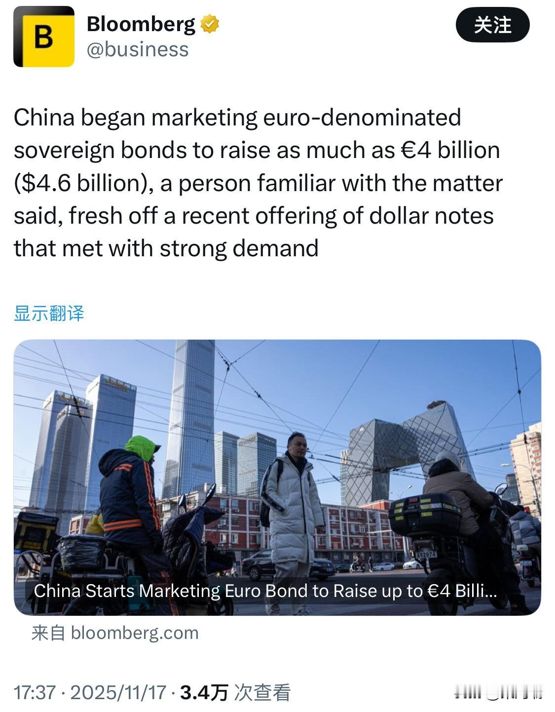 中国发行的40亿欧元主权债被抢爆,峰值订单超过1045亿欧元。 财政部昨日(11月18日)成功发行40亿欧元主权债券,吸引全球投资者疯狂抢购,订单总额一度超过1045亿欧元,创下中国欧元主权债发行史上最高认购纪录,也是近六年需求最强劲的一次。 据彭博社报道,本次发行分为多个期限(主要为4年期和更长期),发行规模严格控制在40亿欧元。但从周一亚洲时段开启认购到最终定价,订单簿迅速膨胀,峰值订单超过1045亿欧元,相当于超额认购26倍以上,远超年初市场预期的12.5倍,也大幅刷新2021年(约4倍)和2024年9月(约8倍)的历史水平。 本次发行紧随11月初40亿美元主权债(订单1182亿美元、超额认购近30倍)之后,连续两场“全球抢中国债”的盛况,显示国际投资者对中国主权信用的认可达到近年高点。最终定价收益率大幅收窄,部分期限已接近甚至低于部分欧元区国家国债水平,凸显中国债券已成为全球机构眼中的“新避险资产”。 投资者结构方面,亚洲投资者占比约50%,欧洲投资者占比显著,中东、主权基金、央行、商业银行、保险和资管机构均踊跃参与。市场人士表示,此次火爆认购既反映了中国经济稳健复苏和政策预期向好,也得益于当前全球利率环境与中国资产的高安全边际。 市场分析人士指出,短短半个月内连续两笔超百亿美元等值主权债被“秒抢”,标志着中国国债正加速融入全球核心资产配置,人民币资产的国际吸引力进入新阶段。