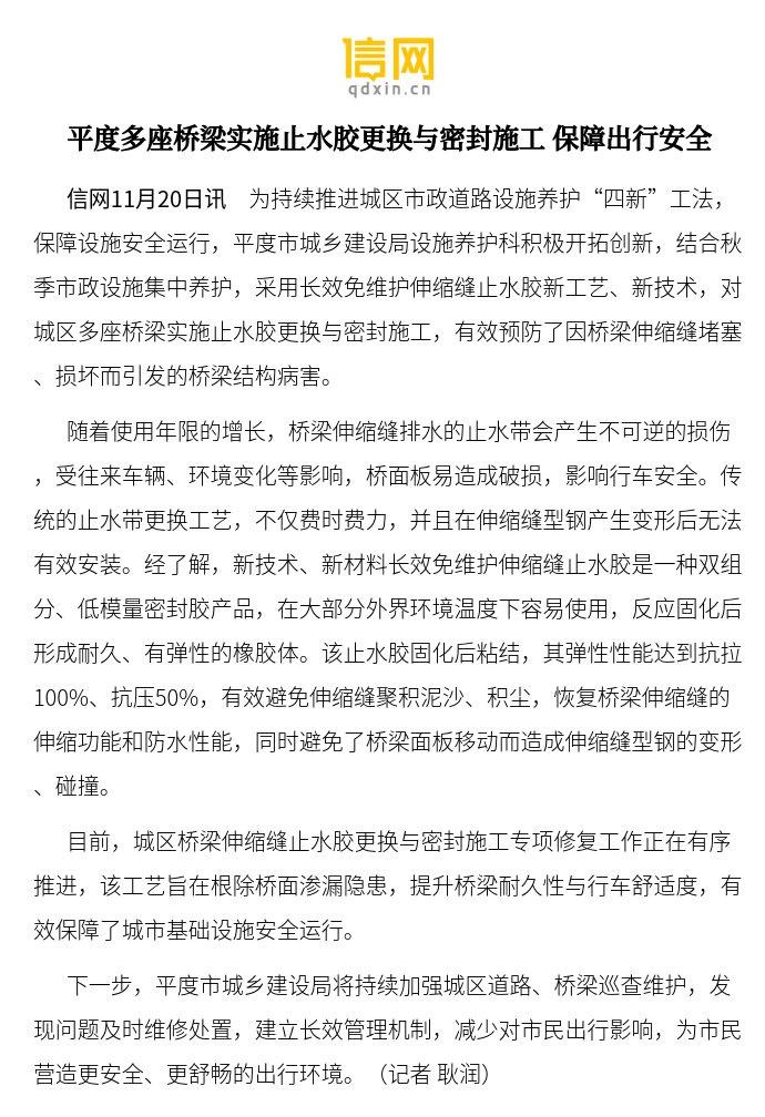 【平度多座桥梁实施止水胶更换与密封施工 保障出行安全】目前,城区桥梁伸缩缝止水胶更换与密封施工专项修复工作正在有序推进,该工艺旨在根除桥面渗漏隐患,提升桥梁耐久性与行车舒适度,有效保障了城市基础设施安全运行。