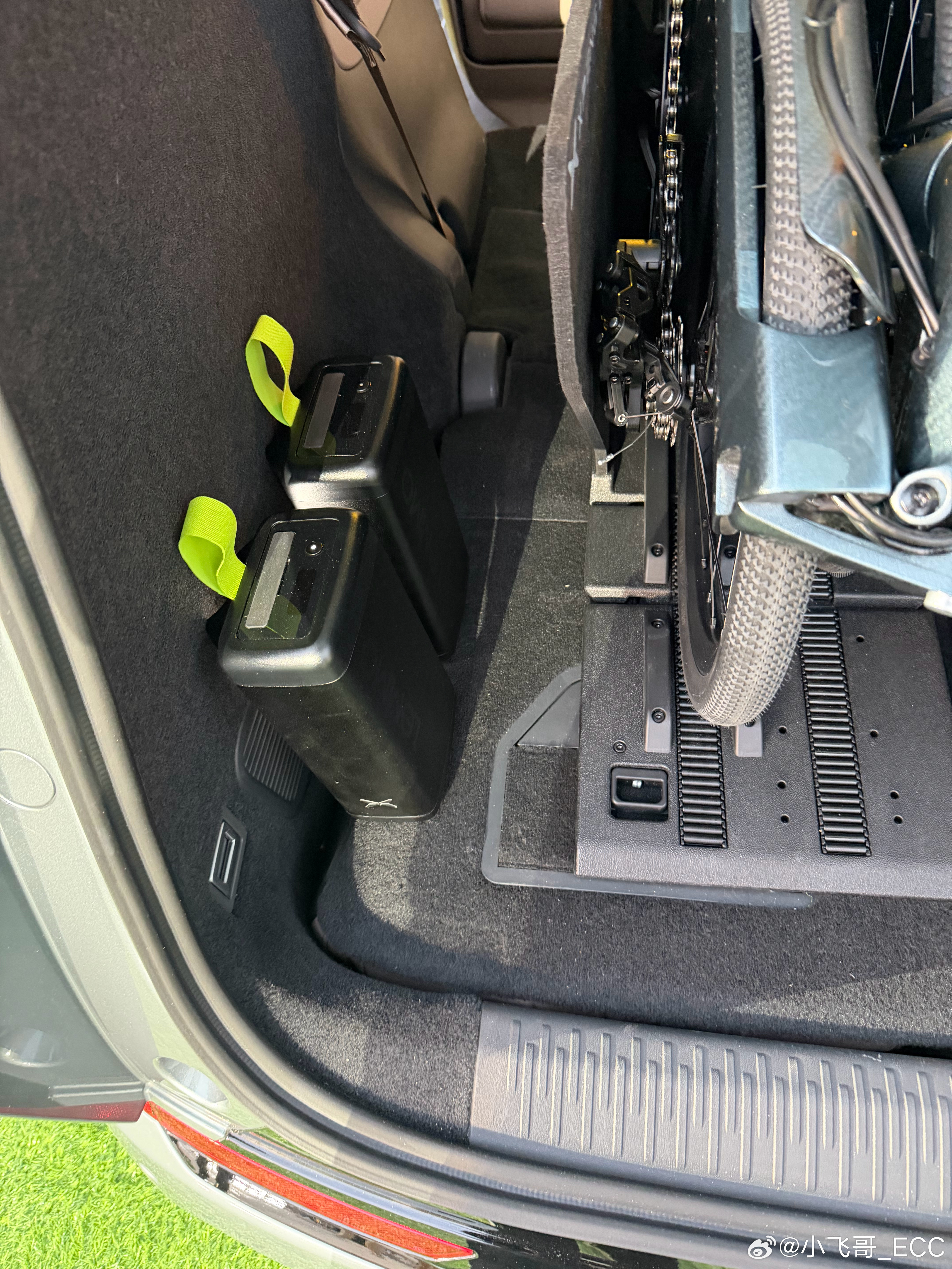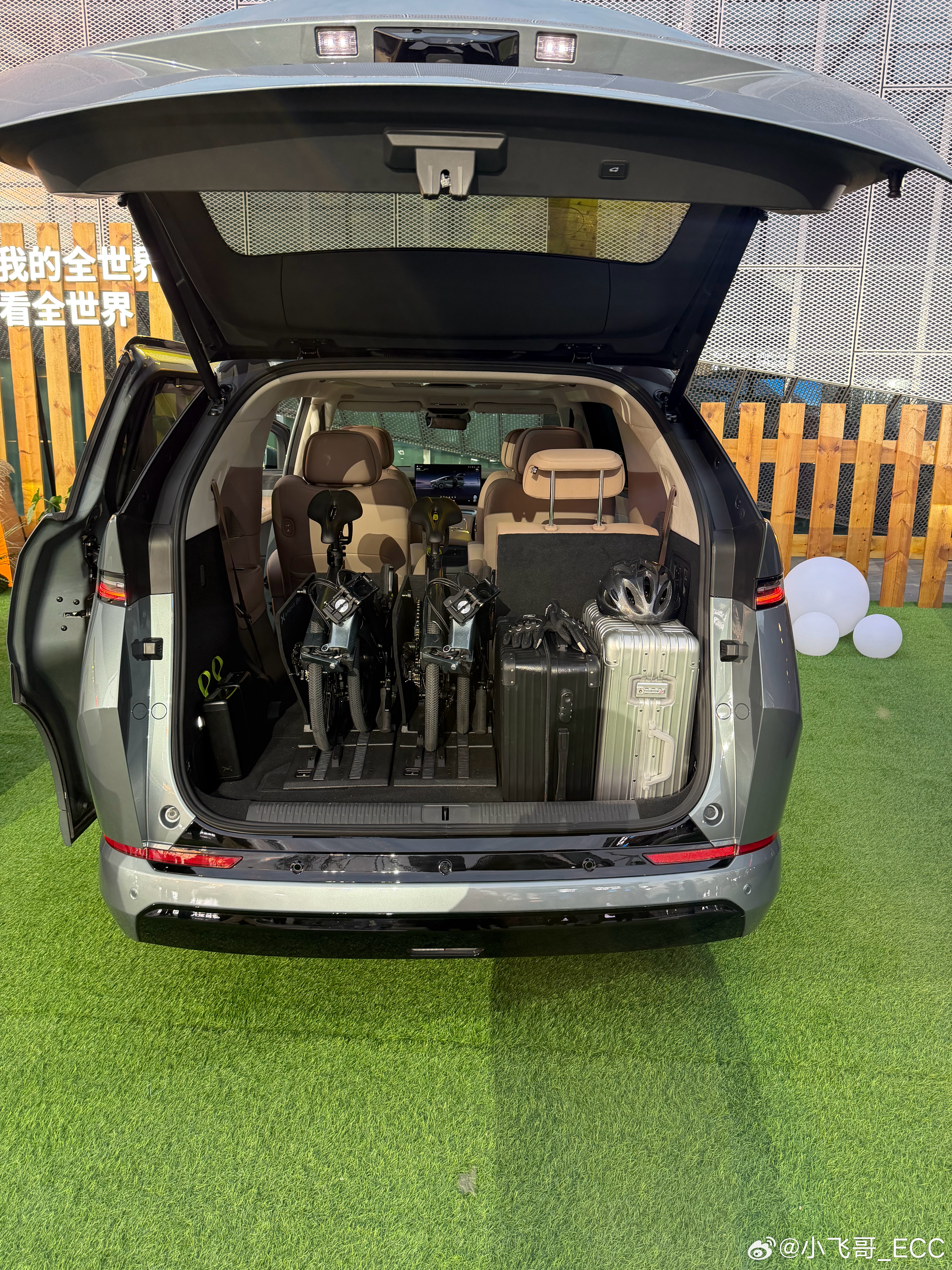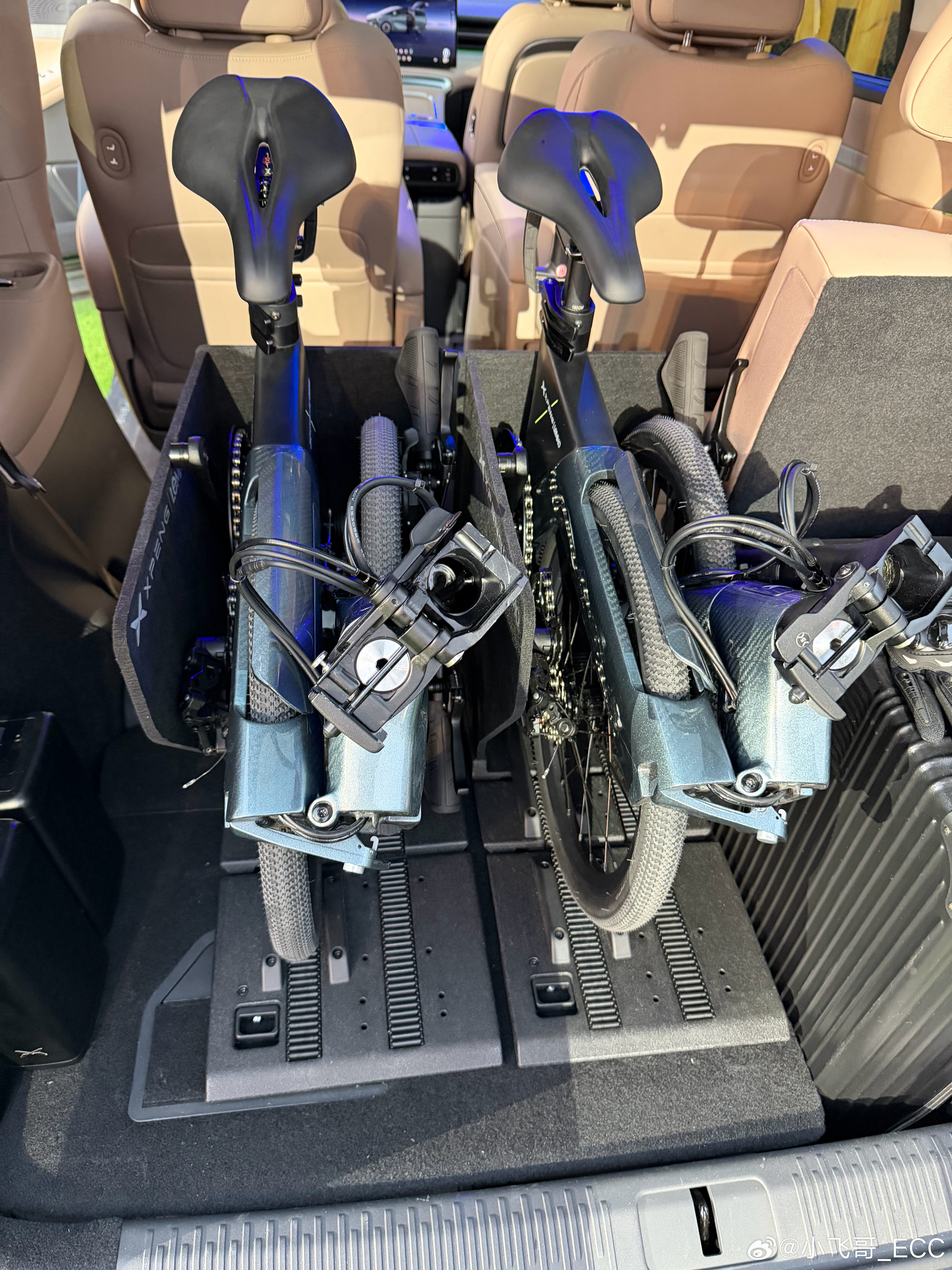 这次小鹏lemmo品牌的自行车做了一个联名款的电动助力折叠自行车。带有全套固定组件,可以直接放在后备箱内,自行车也不用担心晃动,这次X9的三排做了电动4 6放倒功能,这给喜欢骑行的小伙伴提供了很好的功能性。车内坐5个人完全不影响乘坐体验。这样出去露营休闲的时候还可以带几台自行车,到了露营地还可以骑骑车,这个场景非常棒,设计很有巧思。
