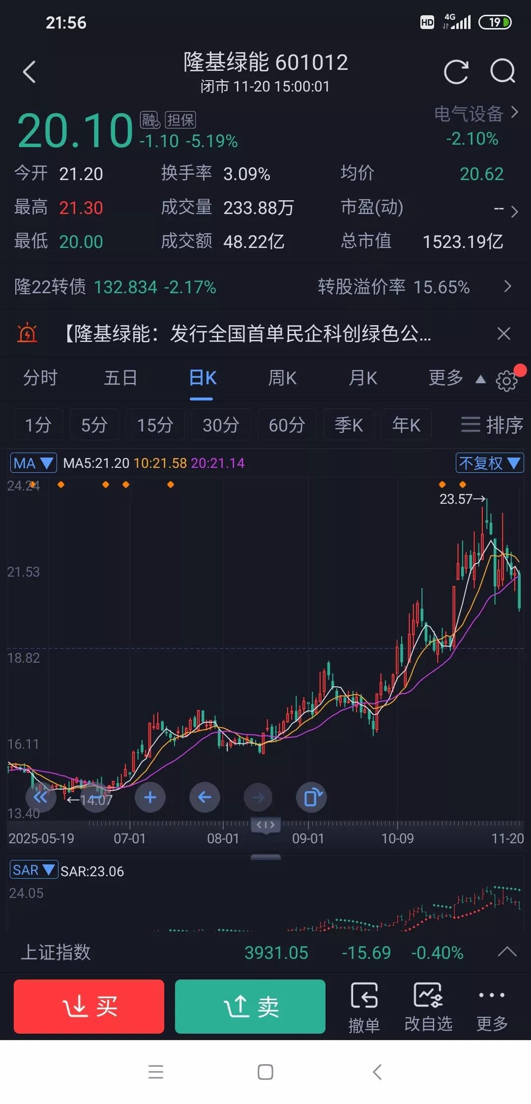 隆基绿能进入下跌模式了? 今天它放量破位下跌,呈现空头排列,加上前期涨幅较大,技术派会仓皇出逃导致今天大量抛压,主力资金净流出5.46亿,近5日累计净流出8.92亿,做多动能不足。 MACD指标弱势,股价跌破20.50元支撑位,逼近20元关口。前期的获利筹码了结意愿强。 其实隆基已经连续7个季度亏损了,今年不知道能不能实现扭亏为盈,那么 跌下来调整是比较好的,只有充分的换手底部逐步抬高,没有哪个股票是不调整直接一直涨的。 这次跌下来只是为了下次涨的更高。不经历风雨怎能见彩虹,曾经的高点50,还能拿下吗?