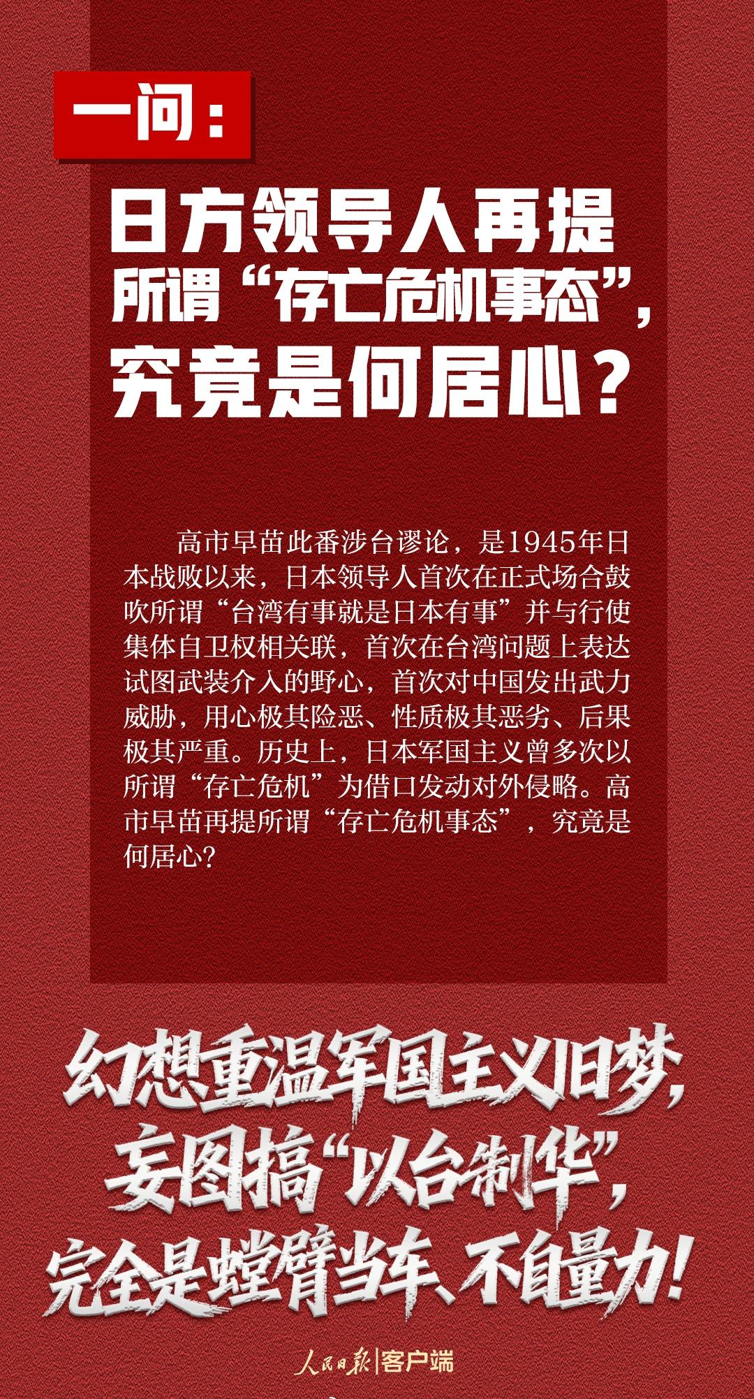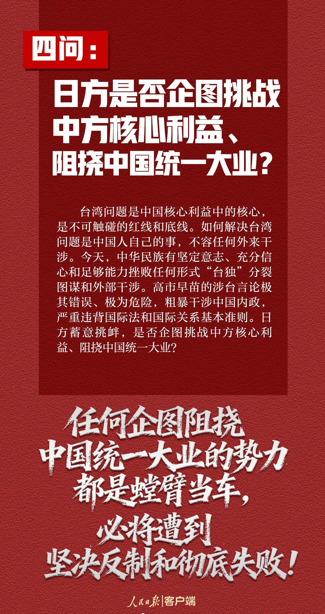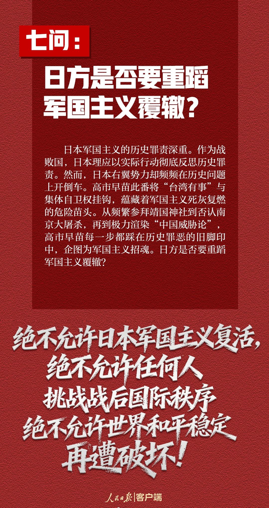 【7个问题日方必须说清楚】在中方多次严正交涉后,日方仍不思悔改,拒不撤回错误言论。这种粗暴干涉中国内政、公然挑战二战后国际秩序的错误言论,引起举世哗然,令正义人士强烈愤慨。日方到底意欲何为?这些问题日方必须说清楚↓↓↓ (人民日报)日本右翼还在幻想往日荣光