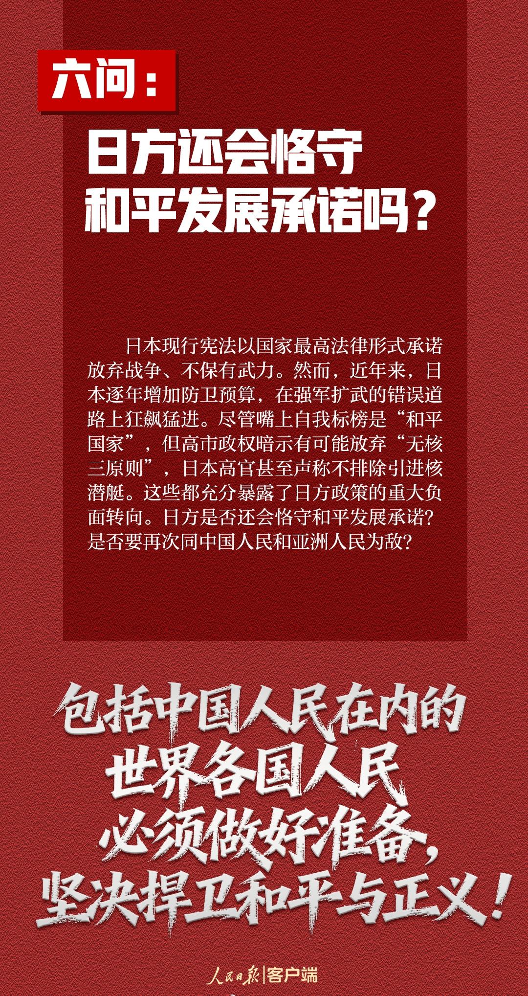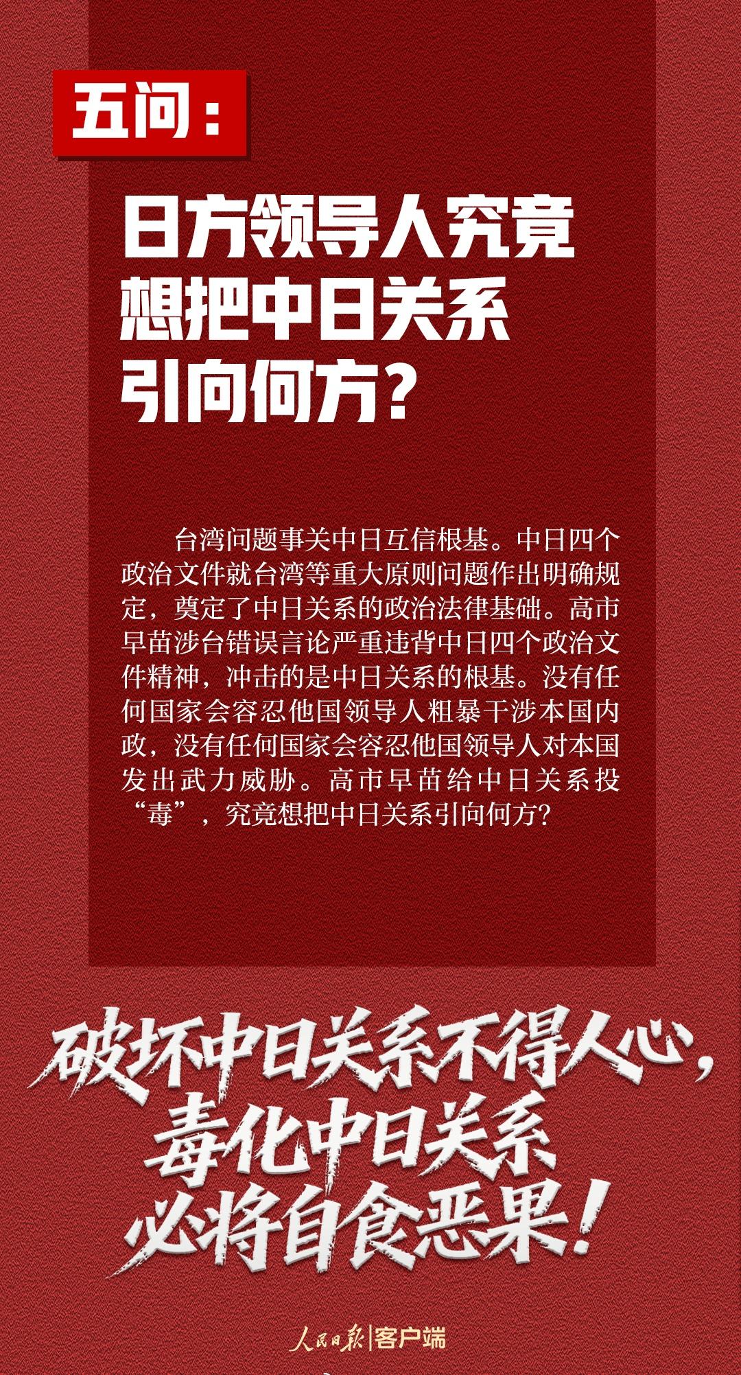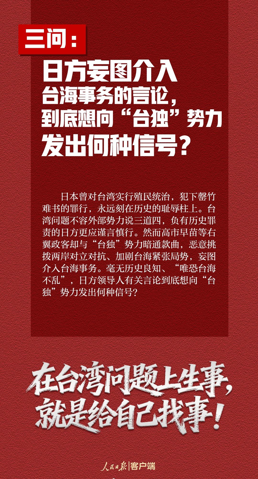 【7个问题日方必须说清楚】在中方多次严正交涉后,日方仍不思悔改,拒不撤回错误言论。这种粗暴干涉中国内政、公然挑战二战后国际秩序的错误言论,引起举世哗然,令正义人士强烈愤慨。日方到底意欲何为?这些问题日方必须说清楚↓↓↓ (人民日报)日本右翼还在幻想往日荣光