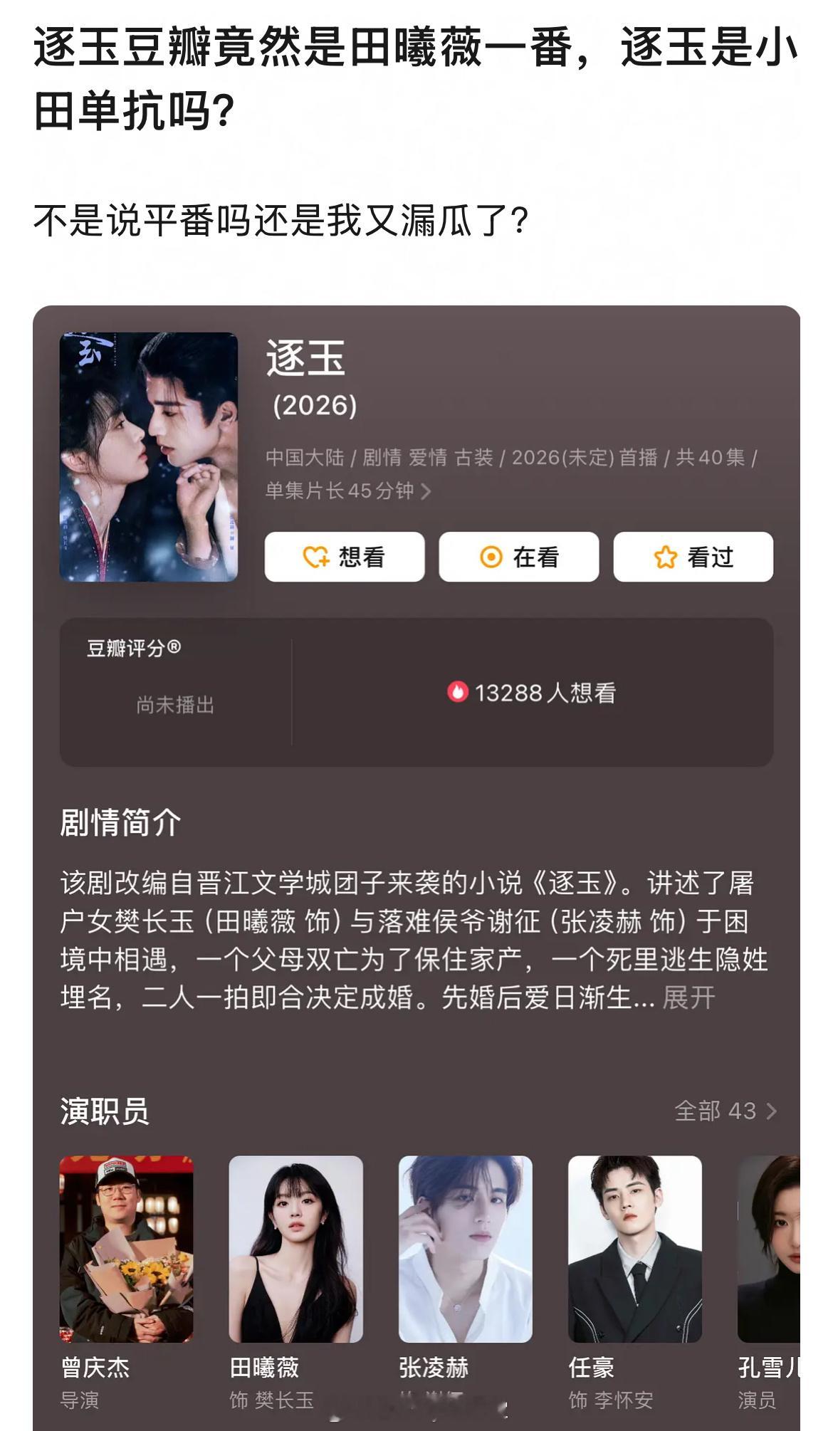 逐玉剧组真的尽力做到平番了吧,豆瓣简介信息显示田曦薇在前,两个平台显示张凌赫在前,谁都不得罪