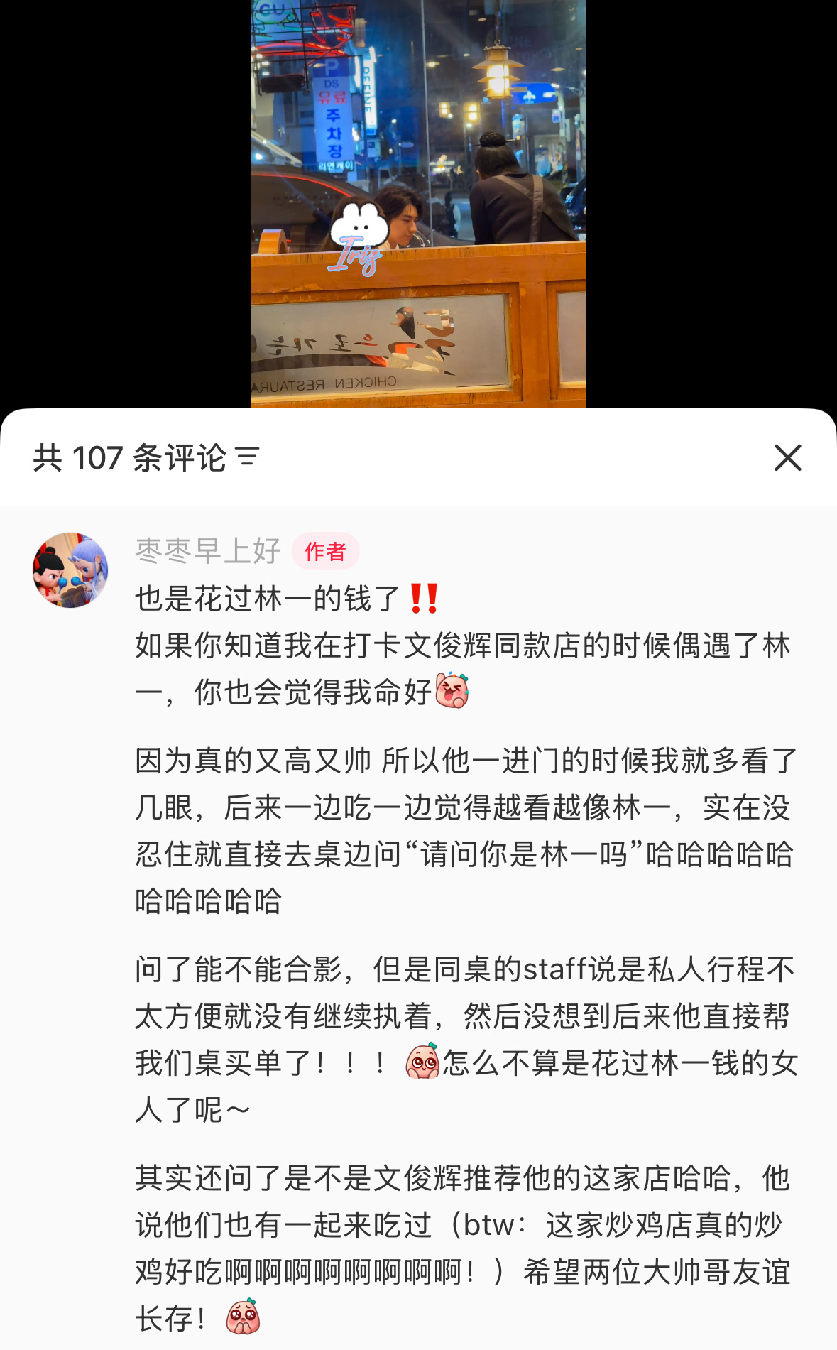 有网友在首尔吃烤肉偶遇了林一哈哈哈哈哈哈哈还是唯爱这家!!!ps:怎么还帮买单啊林一!!!