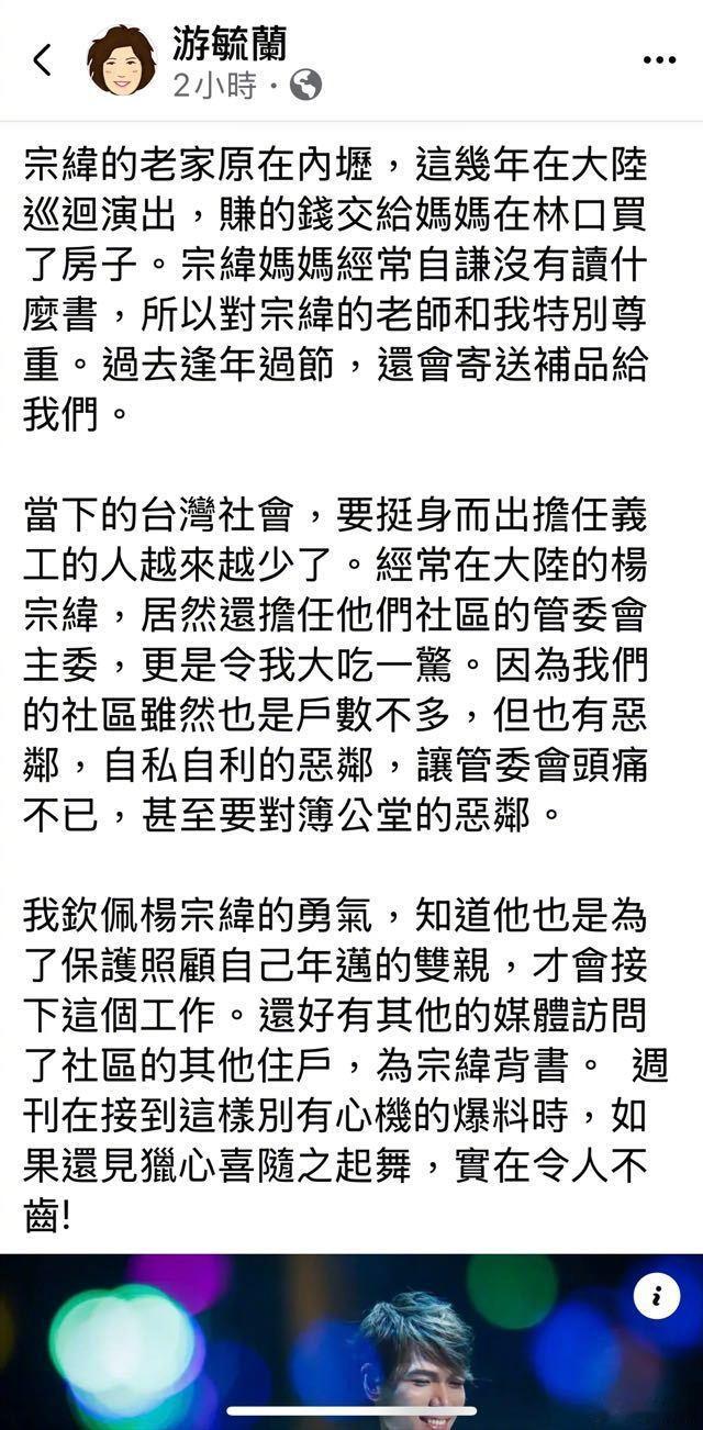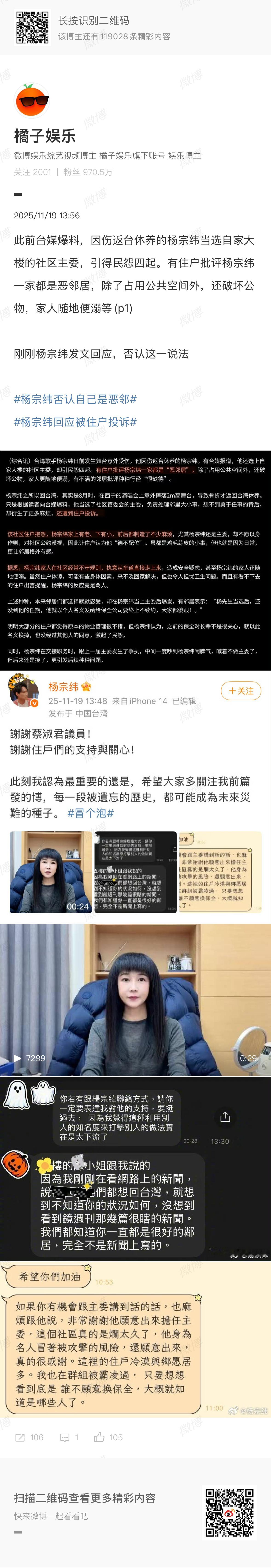 杨宗纬再回应恶邻争议,直接报案了昨日有台媒爆料,因伤返台休养的杨宗纬当选自家大楼的社区主委后,引得民怨四起。有住户批评杨宗纬一家都是恶邻居,除了占用公共空间外,还破坏公物,家人随地便溺等……随后杨宗纬发文回应,否认这一说法(p8-9)