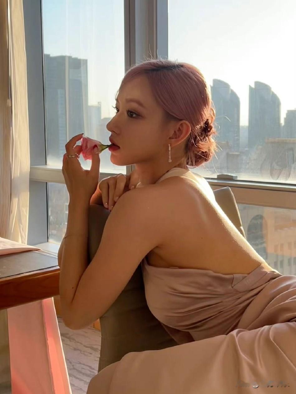 程潇着香槟色长裙,露出性感美背,身材比例优越,笑容迷人,粉色挽发俏皮不失端庄。