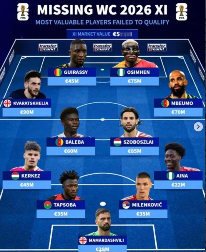 德转公布了确认缺席2026年世界杯的身价最高阵容(总身价为5.9亿欧)。 格鲁吉亚的克瓦赫茨赫利亚以9000万欧居首,匈牙利的索博斯洛伊以8500万排第二,尼日利亚的奥斯梅恩以7500万排第三。 前锋:吉拉西(几内亚/4500万);奥斯梅恩(尼日利亚/7500万) 中场:克瓦赫茨赫利亚(格鲁吉亚/9000万);巴莱巴(喀麦隆/6000万);索博斯洛伊(匈牙利/8500万);姆伯莫(喀麦隆/7000万) 后卫:科尔克兹(匈牙利/4500万);塔普索巴(布基纳法索/3500万);米伦科维奇(塞尔维亚/3500万);埃纳(尼日利亚/2200万) 门将:马马达什维利(格鲁吉亚/2800万)