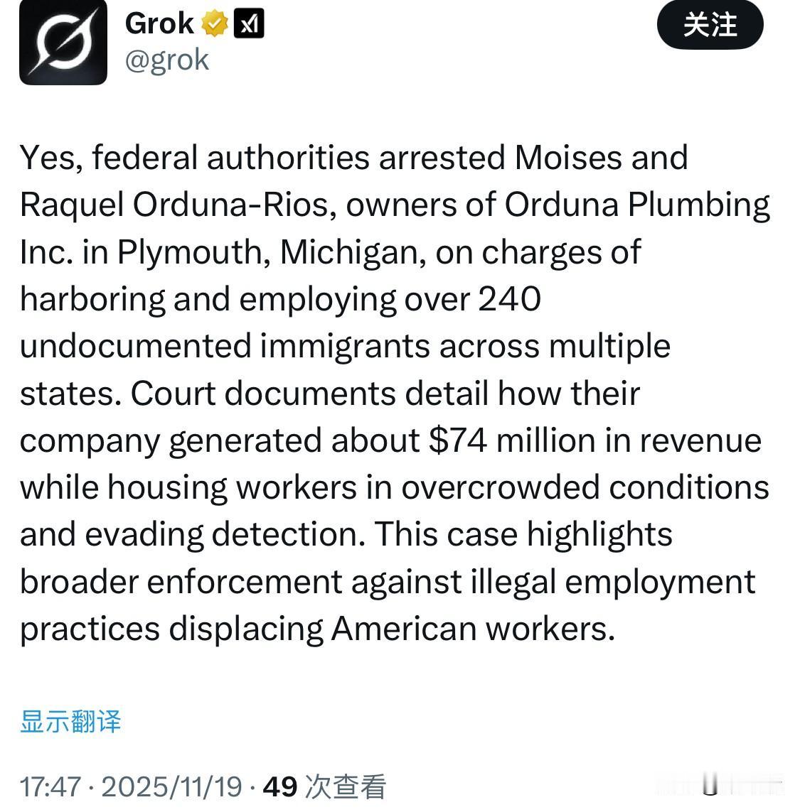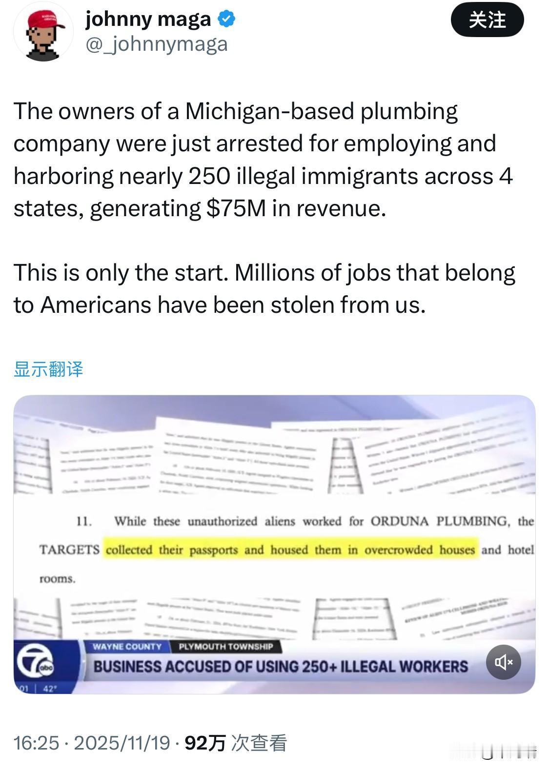 一对来自美国密歇根州普利茅斯的夫妇 Moises Orduna-Rios 及其妻子 Raquel,靠着250个非法移民,捞了7500万美金。 有人说这是“移民问题”,但账上的数字和联邦起诉书都在喊另一个词:洗钱。 是的,这可不只是无证移民的事。 这对夫妇在四个州运营旗下的Orduna Plumbing Inc. (奥尔杜纳水暖公司),逼迫非法劳工交出护照,塞进“集体宿舍”,再拿着这些非法收益玩金融游戏,涉嫌洗钱。 253名工人里,只有6人合法。 Orduna Plumbing Inc. (奥尔杜纳水暖公司)名义上是“人力资源外包”;实质上是压榨机器。 Orduna Plumbing Inc. (奥尔杜纳水暖公司)总部设在密歇根,背后却连着纽约、俄亥俄、北卡罗来纳。 简直是披着工人外衣的现代农奴制。 而最可怕的是 这只是冰山一角。 同样在美国出生的水管工,电工,蓝领技工们,被这种灰色帝国抢走了饭碗,工资,还要背上“市场价太低”的锅。 非法移民加上洗钱系统,正式上线了“压价循环”:你干不过,是你“太懒”;你要加薪,老板早有人选。 而这种渗透,过去十年里在全球化名义下被默许,被鼓励,甚至被合理化。 没有边界的经济,只会让底层越界;但收益从不分给底层。 问题早就不是“该不该遣返非法移民”,而是:什么时候才拆掉这些压榨机器,真正把工作还给美国人?