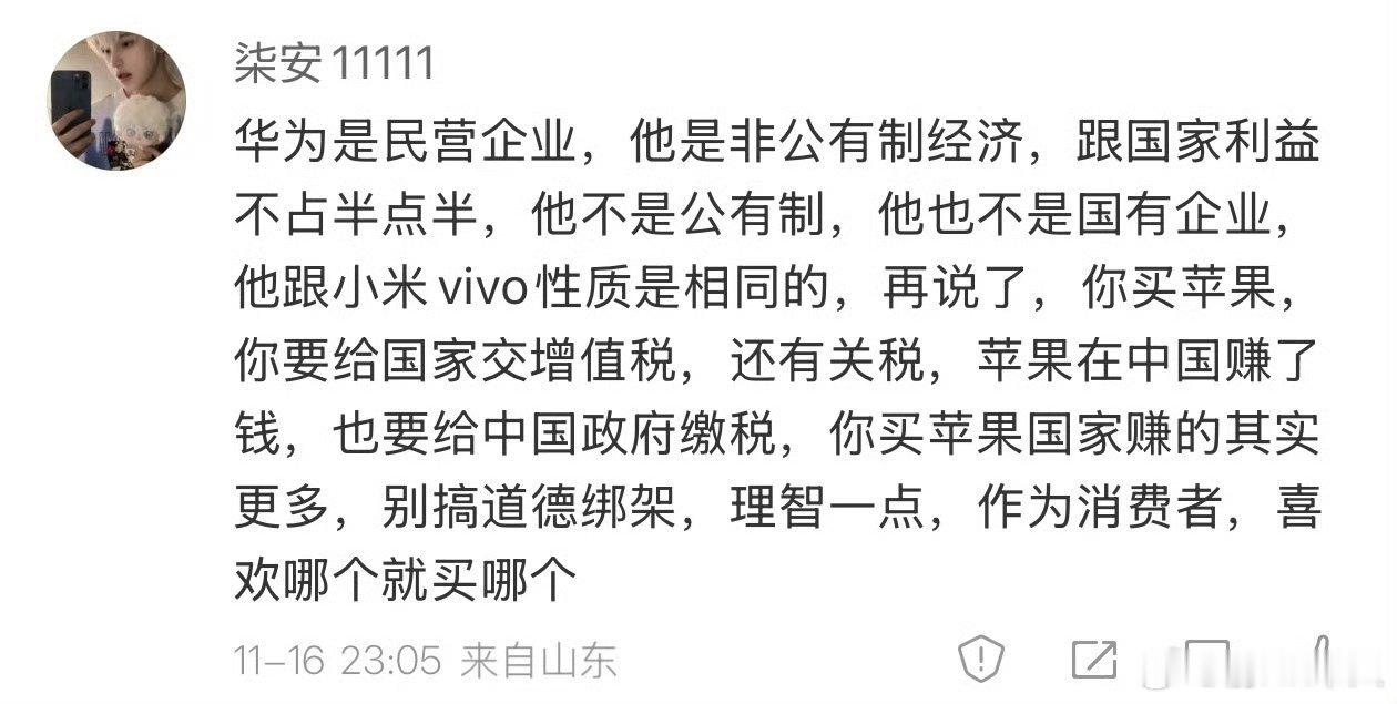 现在还在质疑关键技术国产化,和国产企业意义,这是非蠢即坏的群体。第一,买什么是消费者自由,毫无疑问。但是说成买什么都一样,甚至贡献更大,就是没文化还蠢了。苹果现在来自中国品牌企业的器件已经低于2%,苹果一抛弃欧菲光就导致南昌欧菲光园区接近破产。而华为归来就把欧菲光拉起来活了。这种例子还很多。第二,苹果的研发、股东、主价值链都在美国,你买一个苹果手机,主要养活是美国的价值链。你买一个华为等国产手机,养活的是国内产业链,交更多的税收,员工消费也带动汽车、房子、衣食住行等产业,这让大家都互相有饭吃。苹果手机进口那点税,算什么。国内企业交增值税、红利税和员工所得税才是大头。第三,华为虽然是民企,但是为国家贡献了大量基础核高基技术,对国家贡献只要不蠢就知道,比如开源鸿蒙、欧拉操作系统,带动产业链解决芯片生产和工业软件代替,这是中国能和美国科技战抗衡的底气。所以,把自私自利和无知无耻说成理智,这哪门子的理智?