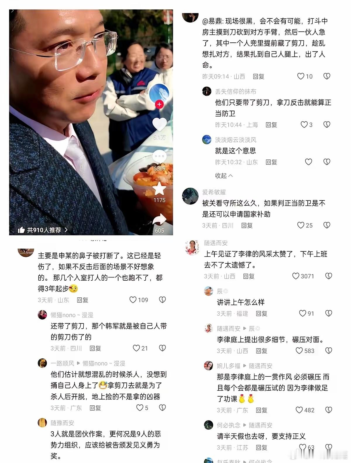 一把剪刀。就为了一把剪刀。整个庭审的命门,竟然就卡在这东西上面。听现场的人说,李圣律师简直是神了,就揪着这个点,把对方问得脸都白了。想想就觉得后怕。鼻梁骨都给人干断了,一群人堵在家里往死里打,这要是没还手,人还有没有都两说。现在呢?现在反倒要拼了命地去证明“我当时为什么敢还手”。你说这事儿可笑不可笑?说白了,剪刀一旦被证实,那性质就彻底变了。那就叫正当防卫。那就不叫互殴。法律有时候就是这么个细节游戏,魔鬼和天使,全藏在里面。就盼着真相能出来,给好人一个公道。不然以后谁家都别锁门了,反正坏人上门,你也只能当个沙袋。