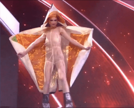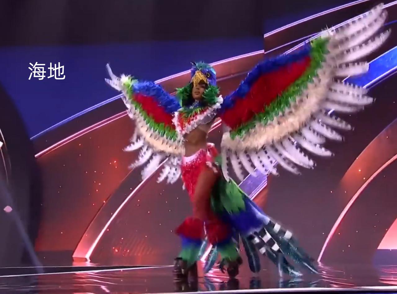 这条“咸鱼”一出场,台下的“环球小姐”都笑不出来了! 民族服饰展示环节,全世界美女们穿上代表本民族的服装,用美貌为国争光。 爱沙尼亚小姐披着狼皮,扮成了雪原上的幽灵公主; 海地小姐化身振翅高飞的国鸟; 波多黎各小姐,变成了踮着脚尖起舞的翠鸟。 但最有节目效果的,还是挪威的“三文鱼”! 表面上看,是一条鲑鱼; 打开后是行走的鱼罐头; 身上甚至还有凸起的鱼刺和粒粒分明的鱼子酱…… 包裹在海鲜中出道的爱与美之神“鲑纳斯”。 谁说北欧人社恐的?这简直E得无法无天了。 不同民族的服装,看得人眼前一亮又一亮的,但看完就只记得这条臭鲑鱼。 这波文化输出,算是被挪威玩明白了。