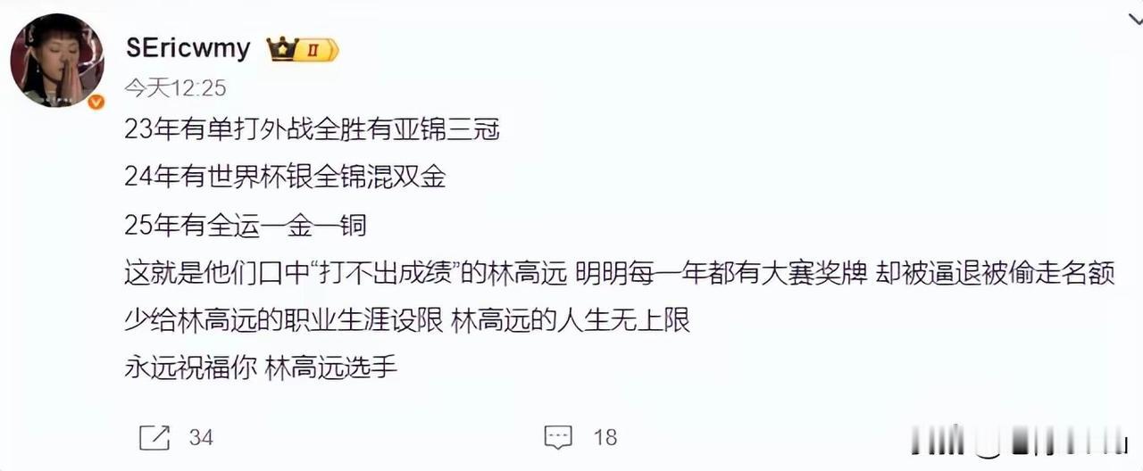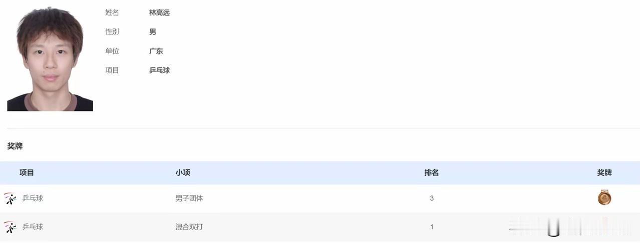 1. 全运会男团广东队获季军 林高远领奖全无喜色:全运会男团广东队获季军,林高远领奖无喜色;30岁身兼男单、男团、混双三项,男团8战6胜,最终拿1金1铜;近年有2023亚锦赛三冠、2024世界杯银牌等成绩。