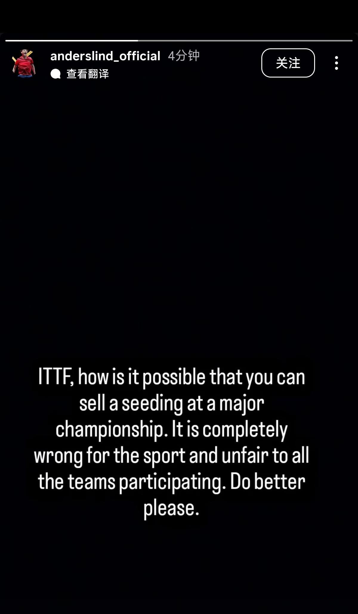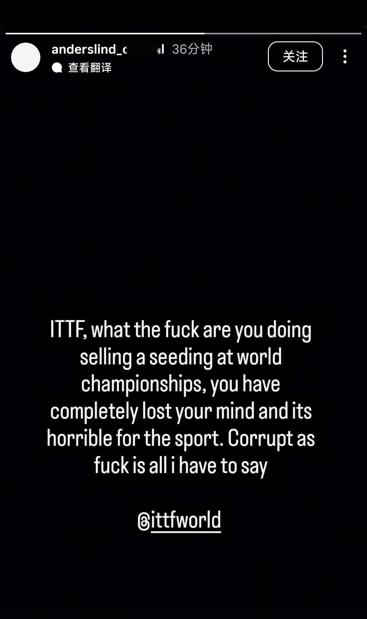 林德深夜发文:ITTF收钱卖种子位, 做签? 我觉得他好像打错了, 林德最近打的都是wtt的比赛, ittf的比赛已经过去大半年了, 没有必要现在才想起来吐槽, 也许想到伦敦世乒赛, 伦敦世乒赛上前七号种子和东道主 单独打循环赛! 他说的很清楚, 是对参赛队伍不公平,应该指的是团体赛! 应该指的是成都混团, 但是成都混团, 林德都没有资格参加, 也许他经常在德国打球训练, 听到什么八卦, 半夜吐槽一下吧…… 种子位是按照世界排名顺序进行分配,没有办法卖! 林德真的是莫名其妙😲……