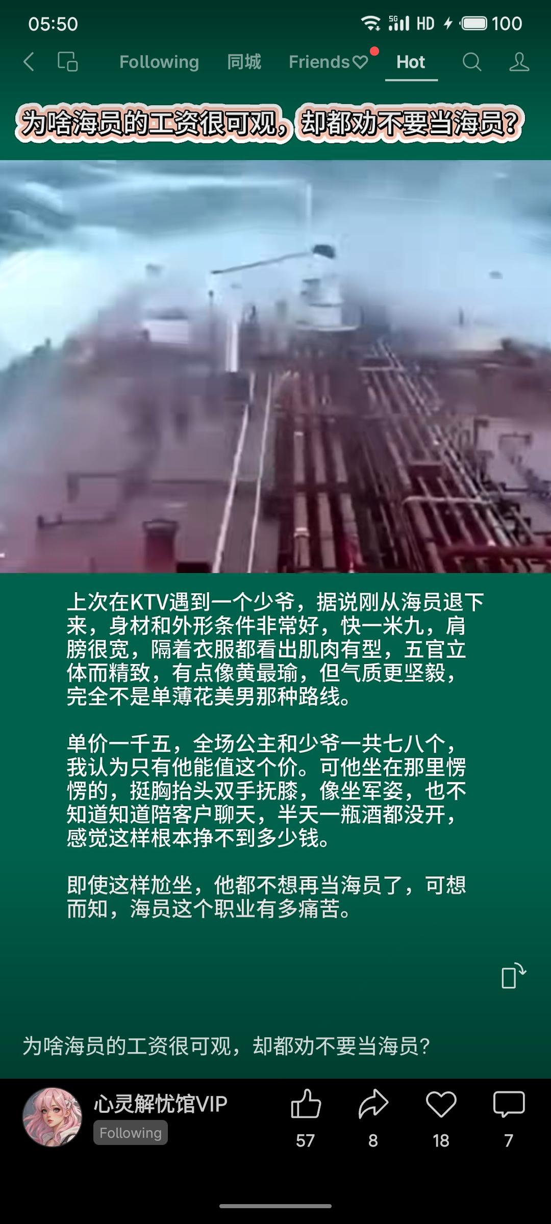 尽管海员工资可观,但一名外形出众的前海员宁可在KTV从事不适应的工作也不愿回归。这反映出该职业可能伴随巨大身心压力与社交隔绝,导致从业者难以忍受。