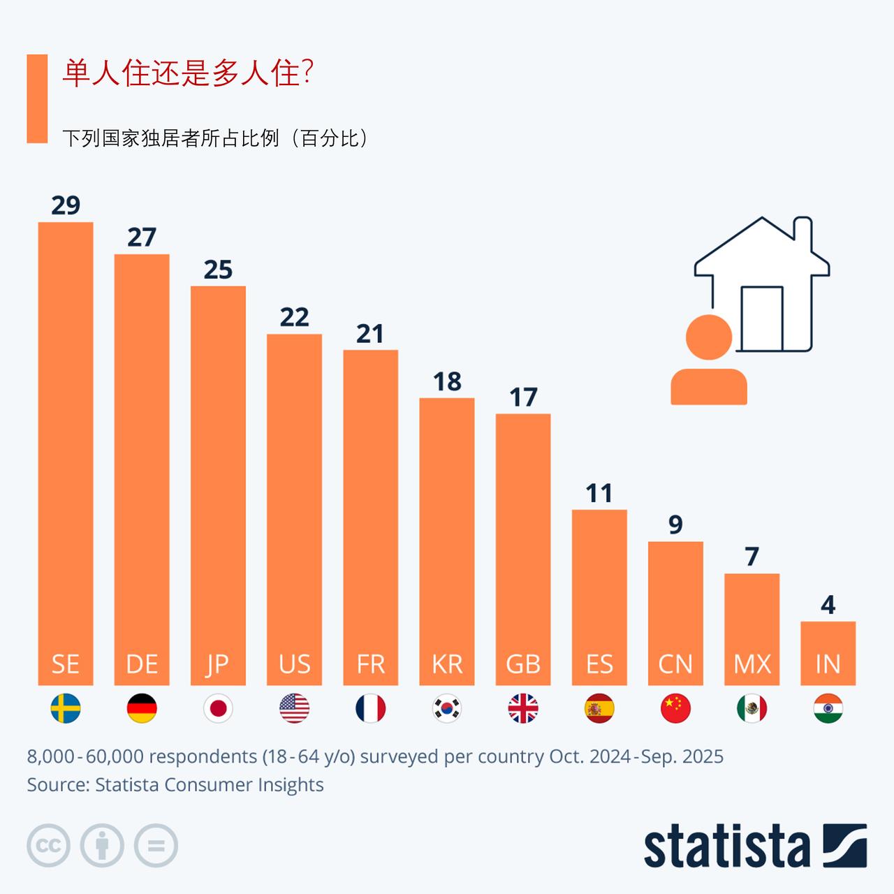 世界上哪个国家独居的人多? 在某些国家,独居的情况比在其他国家更为普遍。来自 Statista 消费者洞察调查的数据表明,在瑞典,年龄在 18 至 64 岁之间的受访者中,约有三分之一表示在调查期间(2024 年 10 月至 2025 年 9 月)自己是独居状态。如下图所示,在德国(27%的受访者选择了这一答案)、日本(25%)和美国(22%)等国家,这种情况也相当常见。 在中国,仅有 9% 的受访者表示自己独自生活,而最常见的居住方式是三人一组的家庭生活,这一选项被 53% 的受访者选择。而在印度,人们更倾向于与更多人共同居住在一个家庭中,最受欢迎的答案是四人(34%)或五人及以上(38%)。在印度,仅有 4% 的受访者表示自己独自生活。这是所调查的 31 个国家中比例最低的。