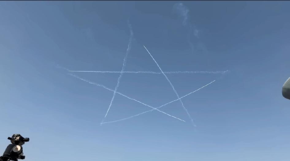 头一次见画五星,要是再多来三架,是不是可以画个我军军徽了! 哇,好厉害,完美的五角星。表面是在画五角星,其实是在画五角大楼,这么说这个五角大楼也是…领土,这就是证据,美国抓紧把领土让出来。只要你把美…打下来,这个领土就是自古以来,不信你翻山海经