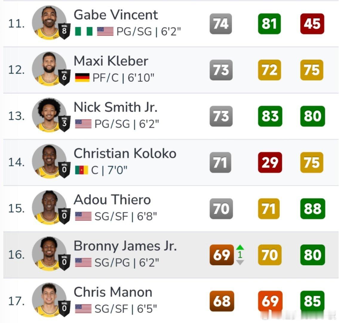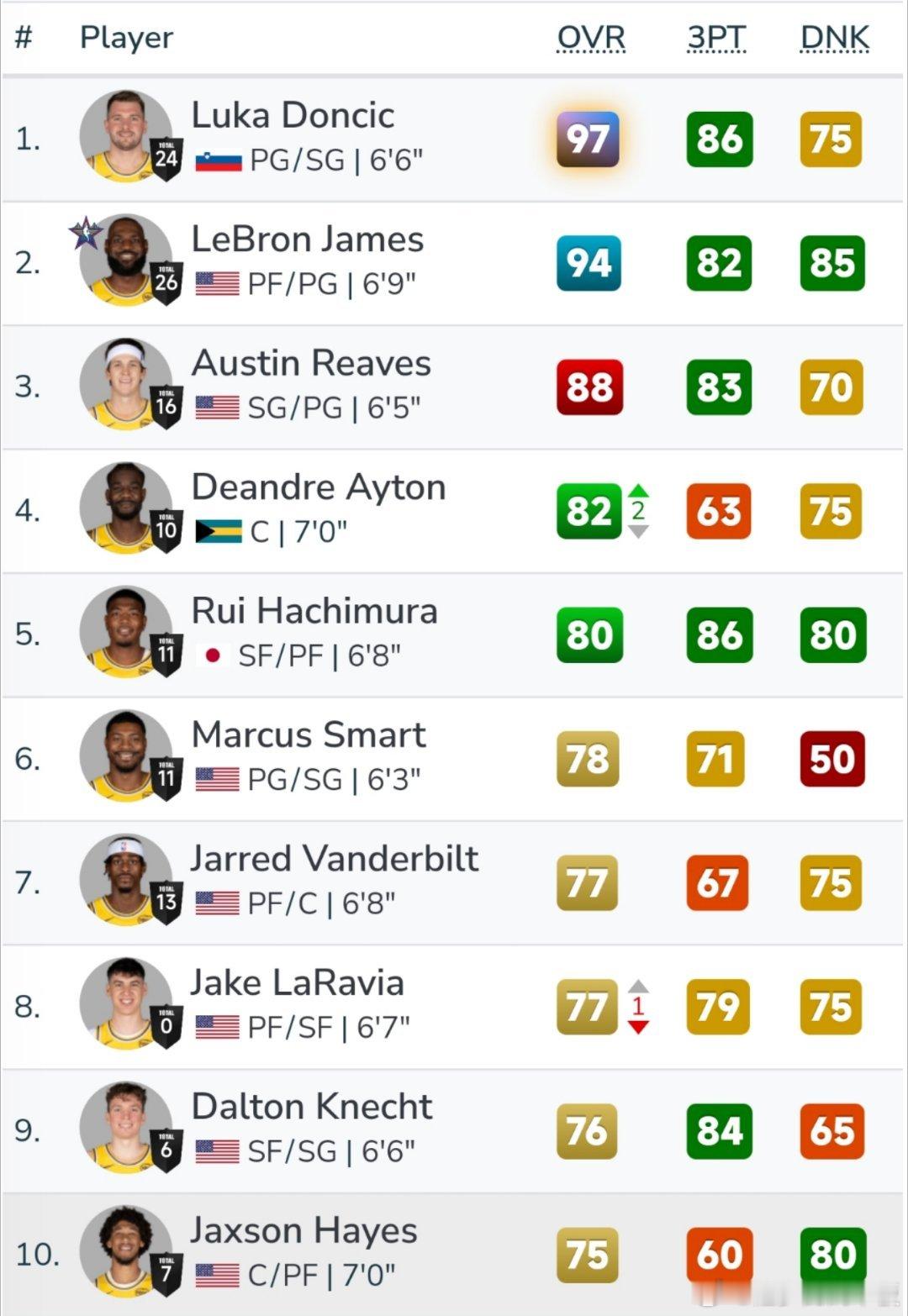 NBA2K26更新球员能力值,湖人此次共有3名球员能力值调整,2升1降艾顿80➡️82拉拉维亚78➡️77布朗尼68➡️69