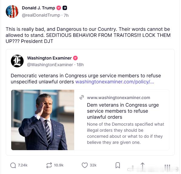 【黄金时代】续前文,然后,川普不解气,再次发推,称:这太糟糕了,对我们国家来说非常危险。他们的言论绝不能被容忍。叛徒的煽动叛乱行为!!!把他们关起来!!!DJT总统