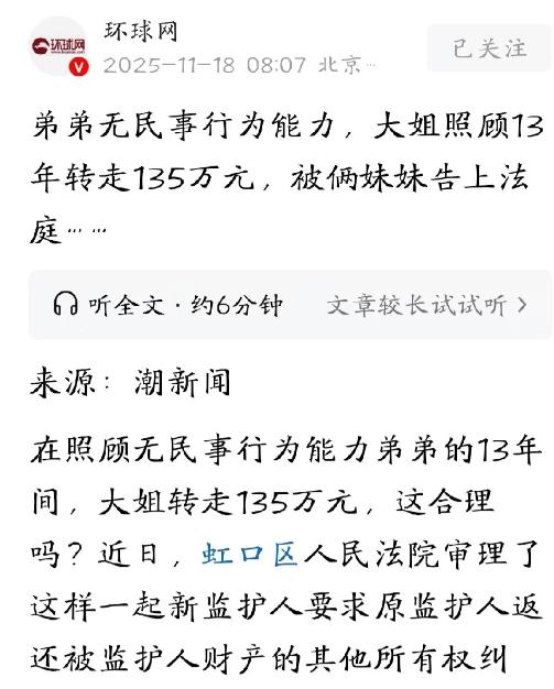 上海,男子患精神分裂,未婚未育,退休后被姐姐和两个妹妹送到了疗养院长期居住。他每月退休金五六千,还攒了上百万元,都交给姐姐代为保管。谁知13年后,妹妹竟然发现姐姐悄悄从哥哥卡上转走了135万余元,但只有很少一部分花在了哥哥身上,其他的全进了姐姐腰包。于是,两妹妹将姐姐告上法庭,要求立刻还钱。法院经过调查,却发现了更加震惊的真相。 上海的刘先生这辈子过得不容易,年轻时就患上了精神分裂症,没结婚也没孩子,父母走得早,身边最亲的人就是一个姐姐和两个妹妹。   2010年他退休时,手里攒下了不少钱,加上每月五千多的退休金,还有六百块交通补助、三百块残疾人补助,每个季度再领三百块敬老补贴,日子本该不用愁。   考虑到他的身体状况,姐妹三个商量后,把他送到了一家精神病疗养院,这里的费用单位还能报销大半,大家都觉得这样安排挺稳妥。   那时候姐妹间的感情还不错,刘先生的三个银行存折和所有证件,都交到了大姐手里保管,大姐还主动说要记账,让两个妹妹放心。   刘先生自己也信任这位最敬重的大姐,把所有积蓄都交了出去,没多想过后果。谁也没想到,这份信任一放就是十三年,最后竟成了亲情破裂的导火索。   亲情的裂痕,源于2023年父母遗留老房的拆迁事宜。   为分割拆迁补偿款,三姐妹多次争执不休,曾经的手足情谊在利益纠葛中荡然无存。   激烈的争吵中,两个妹妹想起了自己哥哥财产的管理。   此前因顾及亲情,她们从未核查过账目,可大姐在拆迁款分配中的强硬态度,让她们不得不怀疑:弟弟的财产是否也遭了算计?   疑虑之下,两个妹妹决定通过法律途径维权,首先向法院提出了监护权变更申请。   法院介入调查后发现,大姐多年来频繁从刘先生账户提取现金,个人财产与被监护人财产存在明显混同。   因此,法院最终裁定变更监护权,由两个妹妹担任刘先生的法定监护人。   当她们从大姐手中接过存折与证件,调取银行流水后,眼前的数字让二人脊背发凉,2010至2023年间,累计有135万余元从刘先生账户转出。   刘先生长期在疗养院生活,饮食起居均有专业医护负责,单位报销后个人所需承担的费用极少,135万元的支出显然不合常理。   面对妹妹们的质疑,大姐却显得理直气壮,称自己多年来悉心照料,不仅每月接弟弟外出居住,还专门租房并装修,日常饮食、就医等开销更是由她垫付,这些花费加起来并不少。   但法院调取的证据,却戳穿了这一说法,疗养院记录显示,十三年间刘先生仅被接离院区66次,年均不足六次,其中有三年因病情加重,医生明确禁止其离院。   大姐所说的出租屋,内部采用北欧风格装修,完全贴合其女儿的喜好,实际居住者也是大姐全家。   更令人愤慨的是,刘先生名下另有一套小房产,被大姐私自出租近十年,租金全部归入个人   法院审理过程中,明确《民法典》中的规定,监护人不能把财产用到被监护人以外的地方, 经法官核算,将刘先生十三年间所有合理开销尽数计入,总额不到50万元。   综合考量大姐确有过接送、探视等履职行为,法院最终判决其向刘先生返还70万元。   这起案件暴露出的社会问题引人深思,最为突出的,便是无民事行为能力人监护环节的财产监管盲区。   现实中,不少家庭仅凭亲情维系监护信任,缺乏必要的监督制约机制,这就给个别监护人滥用职权、谋取私利提供了可乘之机。   更有甚者,部分监护人对自身职责认知模糊,将“照料”等同于“获利”,擅自将被监护人财产视为己有。   对刘先生而言,70万元的返还固然挽回了经济损失,但十三年间被蒙骗的委屈与破碎的亲情,却再也无法复原。   这起事件也给所有家庭敲响警钟,监护权本质是责任而非特权。   即便是至亲之间,涉及财产保管也应明确边界,定期核对账目,建立必要的监督机制,避免让信任沦为贪婪的温床。   金钱损失尚有弥补可能,而凉透的人心,终究难以回暖。