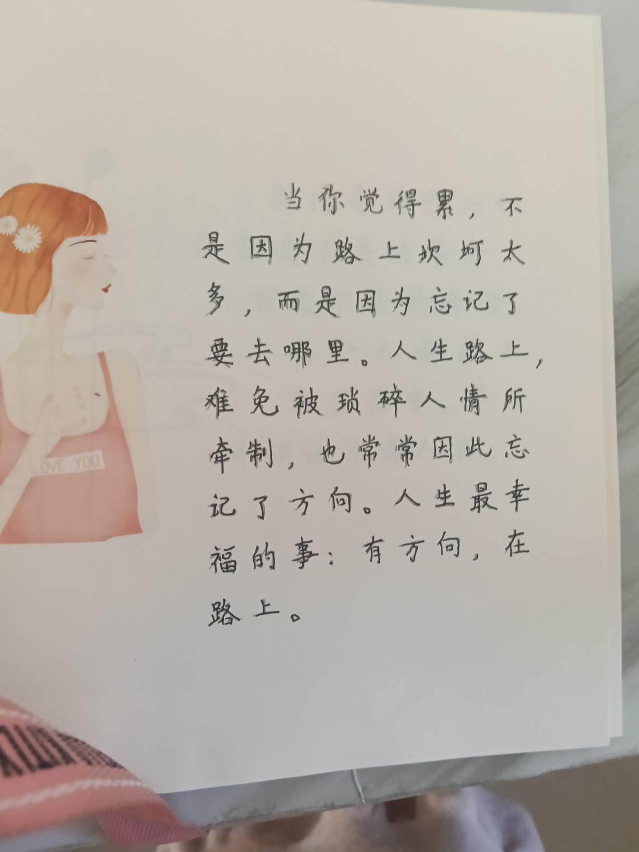 抄书打卡第七天 生活里最大的疲惫,往往不是路途崎岖,而是我们走着走着,忘了为何出发。 被日常琐事牵绊,为人情往来所累,最初的梦想渐渐模糊。 其实幸福很简单:心中有方向,脚下有行动。 此刻起,找回你的目标,重新出发。因为人生最美好的状态,永远都是——有方向,在路上。抄书打卡 每日抄书 每日抄写