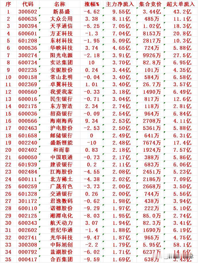 11月21日开盘45分钟,主力资金“买入的 ”的35名单一览! 新易盛:净流入 9.55亿元,超大单流入 43.2亿元 大众公用:净流入 8.11亿元,超大单流入 11.1亿元 天孚通信:净流入 7.05亿元,超大单流入 18.3亿元 方正科技:净流入 7.04亿元,超大单流入 20.8亿元 东材科技:净流入 5.09亿元,超大单流入 10.3亿元