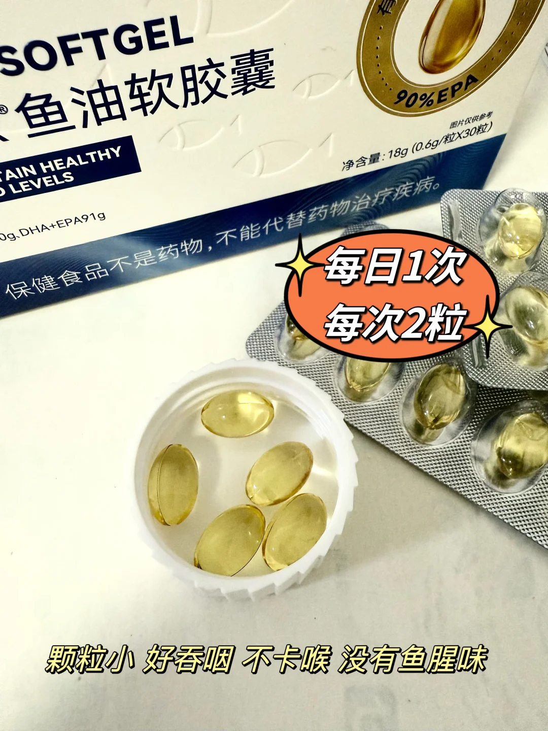 胶囊是明胶包裹住的,没有鱼腥味,也很好吞服,每天2粒就能满足血管“减负”需求,随餐吃就行不用特意记。独立泡罩设计的出门携带也方便。