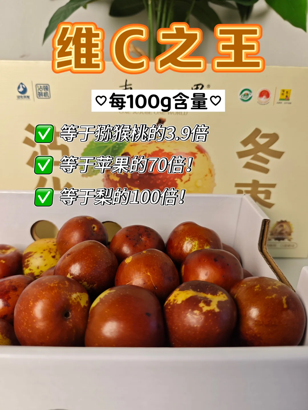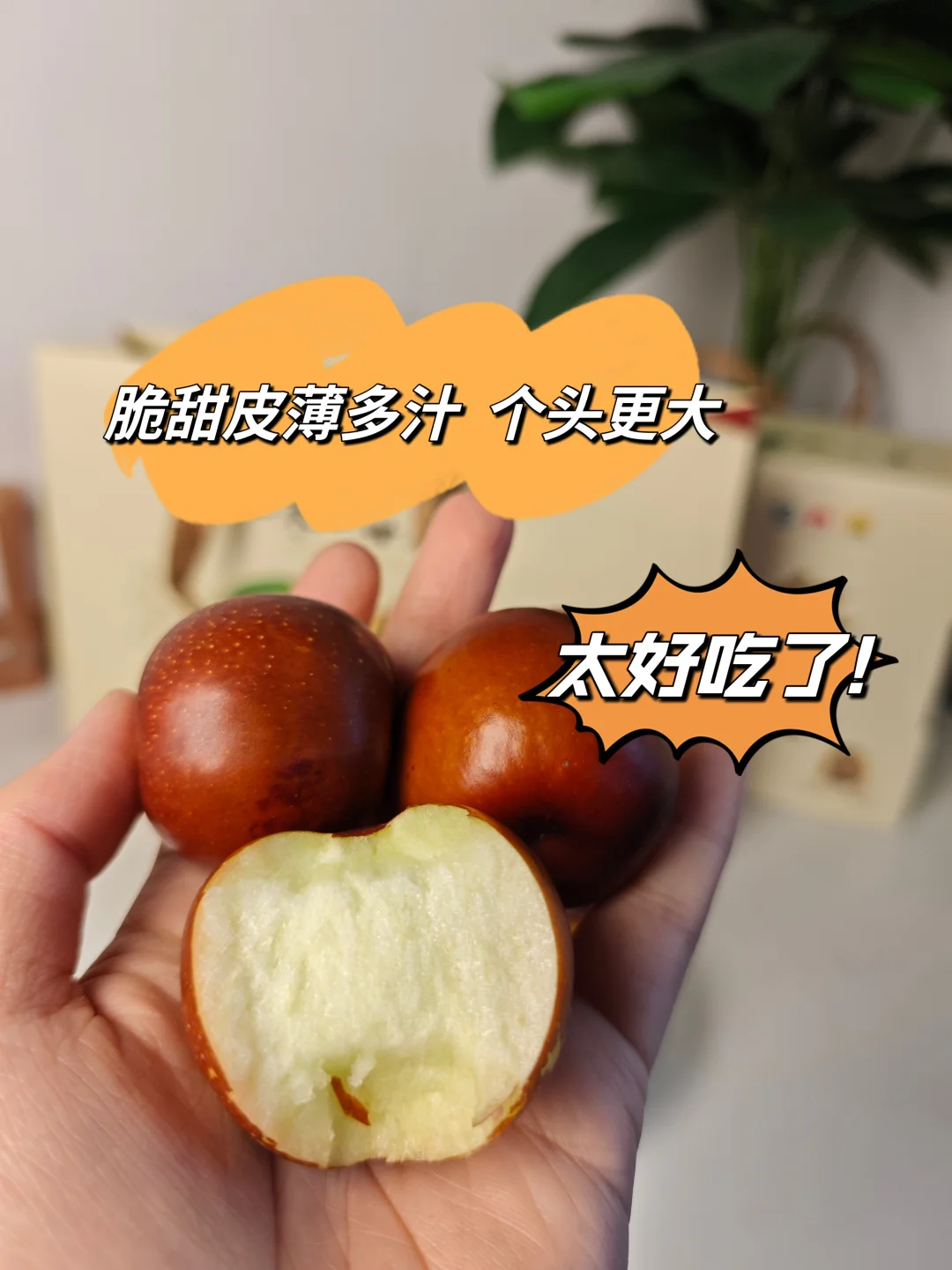 它的个头翻倍,扁圆饱满像小灯笼,平均 20g 以上,比普通冬枣大一圈,皮薄肉脆,甜度高达38°,汁水更是饱满,而且营养拉满,除了维 C,还有 19 种必需氨基酸,养生党狂喜。刚收到的冬枣带着新鲜果霜,洗干净直接啃,第1️⃣口就被脆度惊到!完全没有普通冬枣的硬渣感,越嚼越甜还不齁,不知不觉就能炫半斤~ 冷藏后吃更像 "天然水果冰棒",解腻又爽口!