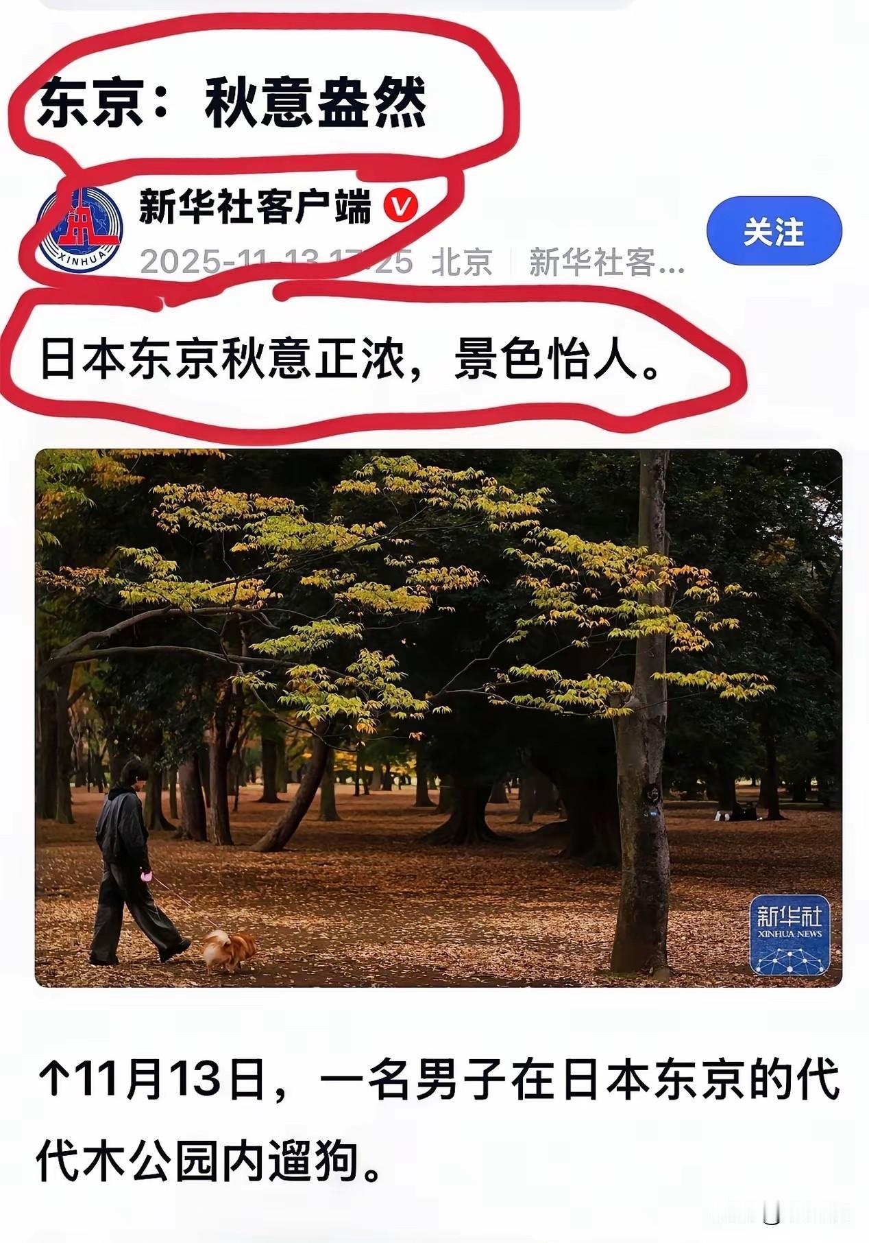 秋天来了,东京秋意盎然!还是没看懂新华社这篇文章的出发点!难道是指东京进入了秋天,马上要进入冬天了。日本的国运难道要秋天并入冬了吗!