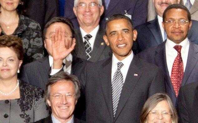 幸亏他脸大, 还能露出一圈! 奥巴马发现有人瞄准了蒙古总统的脸,赶紧保护。 可恶