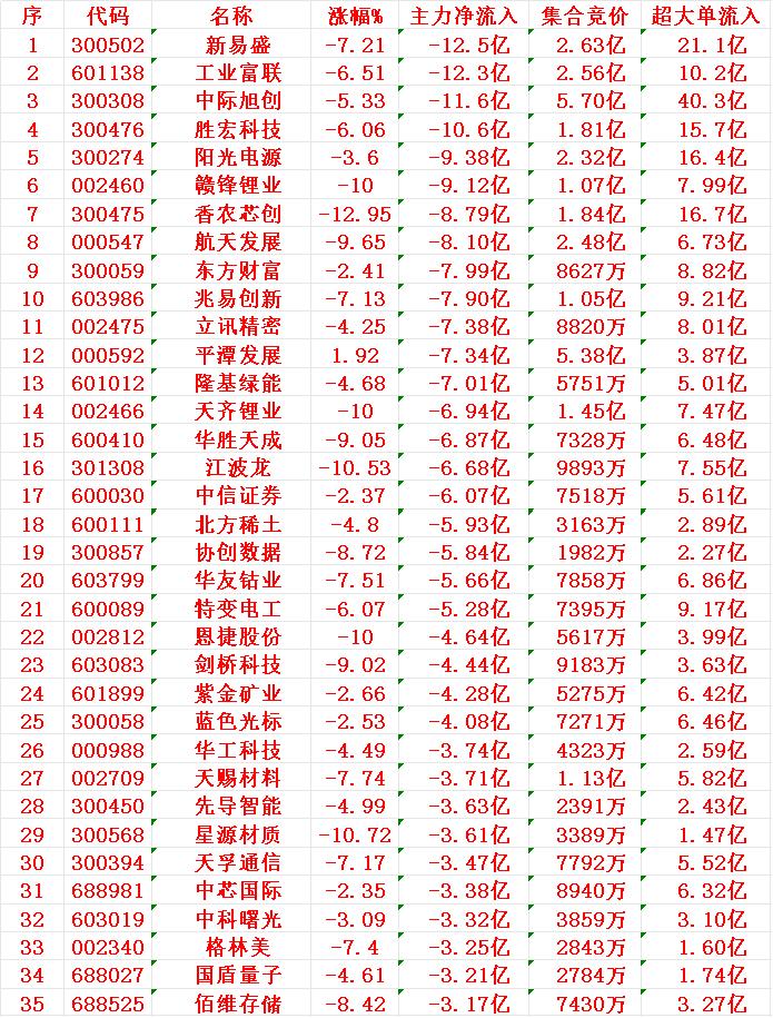 11月21日上午盘,主力趁低位,大幅买入的35名单: 凯美特气:涨幅 +10.01%(涨停),主力净流入 6.94亿元 赛微电子:涨幅 +11.12%,主力净流入 4.13亿元 龙溪股份:涨幅 +10.00%(涨停),主力净流入 3.50亿元 特发信息:涨幅 +10.00%(涨停),主力净流入 3.48亿元 11月21日中午收盘,主力资金“大幅卖出”的35名单: 新易盛:涨幅 -7.21%,净流入 -12.5亿元 工业富联:涨幅 -6.51%,净流入 -12.3亿元 中际旭创:涨幅 -5.33%,净流入 -11.6亿元 胜宏科技:涨幅 -6.06%,净流入 -10.6亿元 阳光电源:涨幅 -3.60%,净流入 -9.38亿元