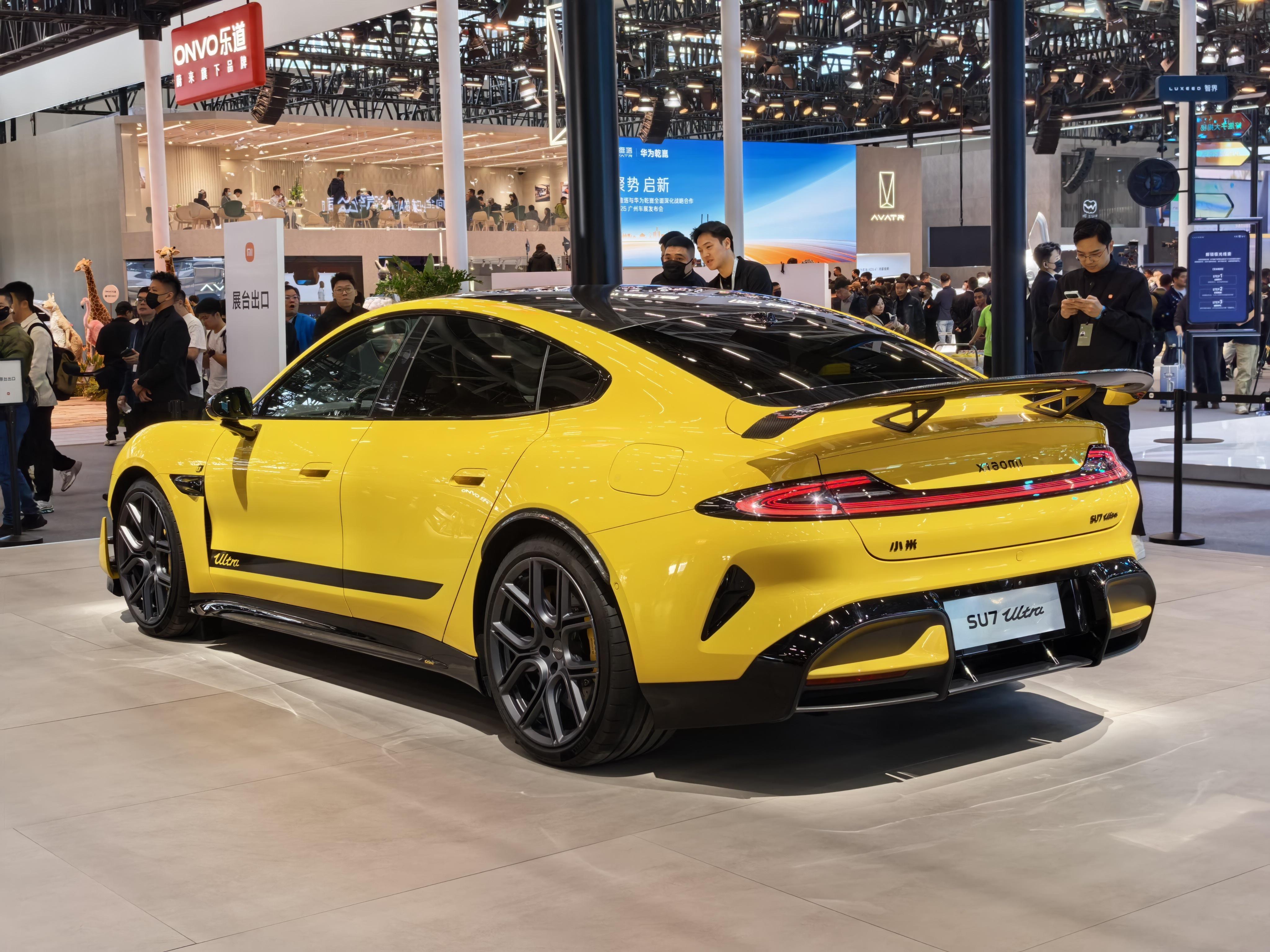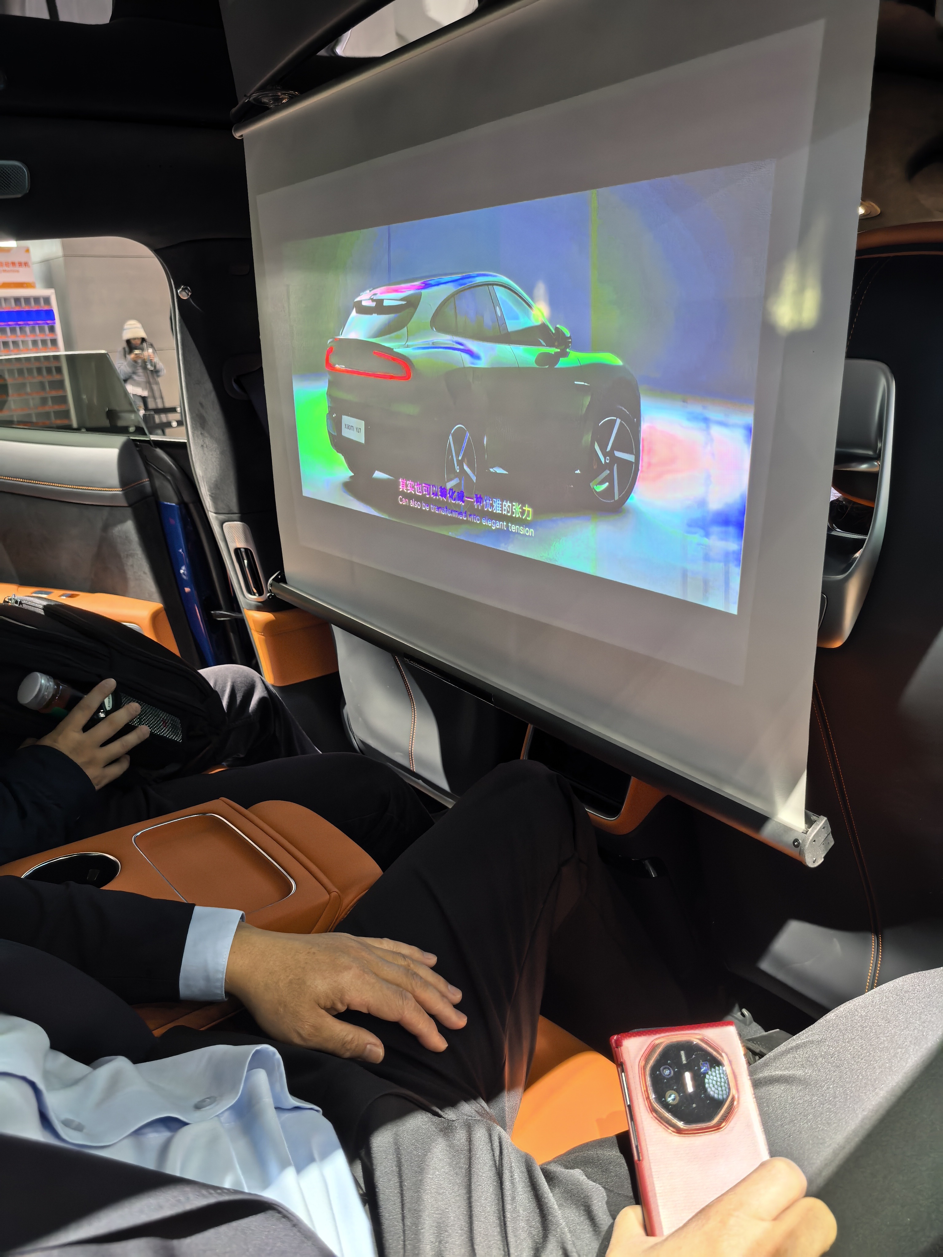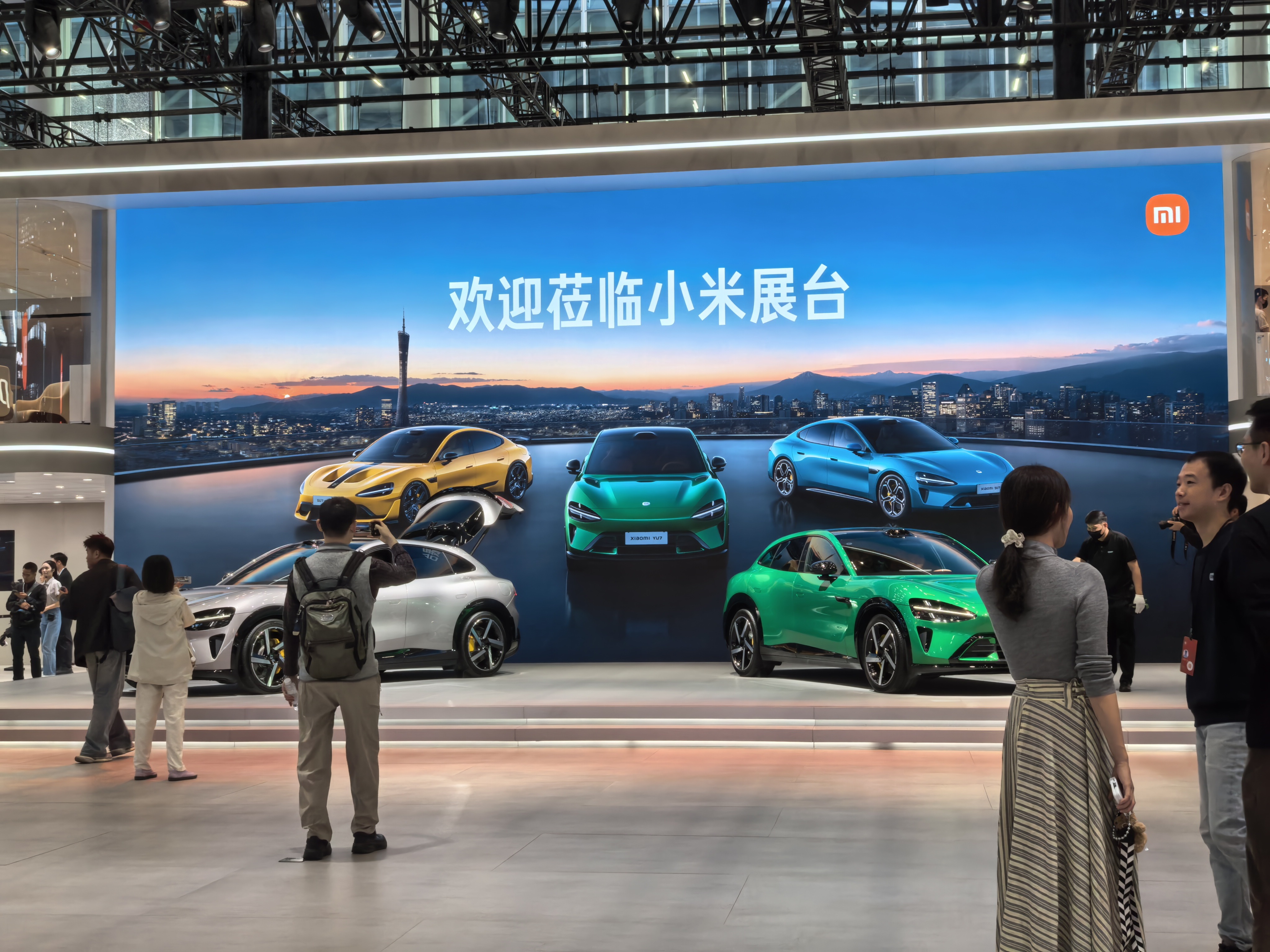 广州车展,小米展台,人也不少。最亮眼的还是这台加装很多配件的小米 YU7。特别是后排投影,直接变成大荧幕,扩展性很强