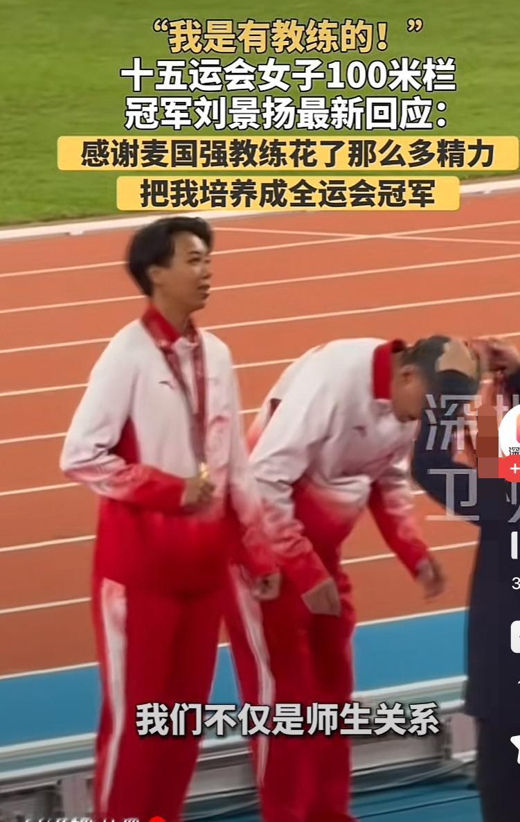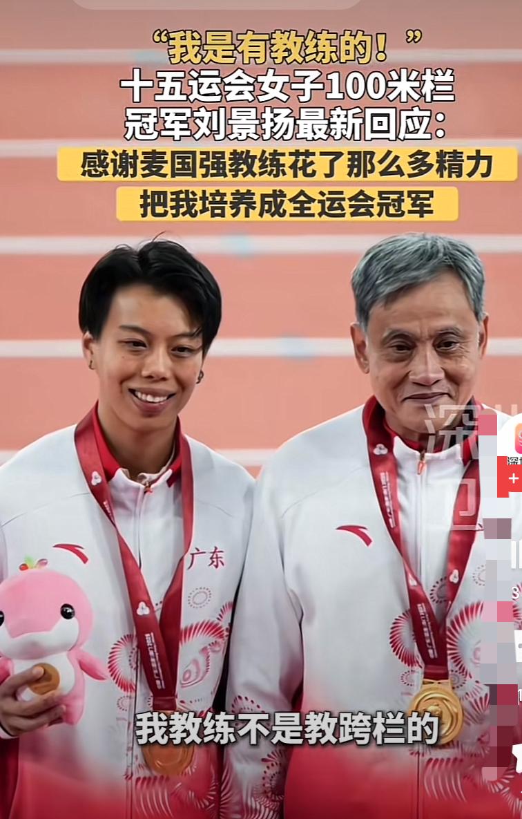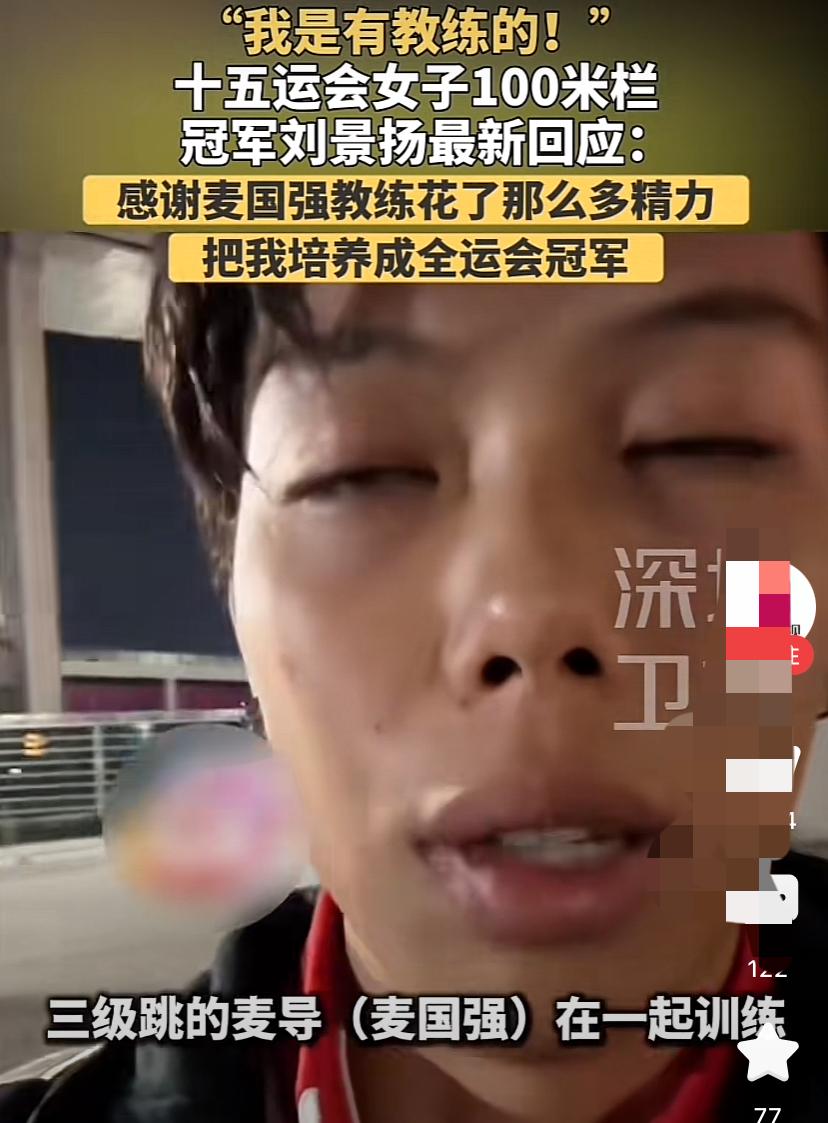 三级跳的教练培养出了女子100米栏的全运会冠军 刘景扬获得女子100米栏冠军接受采访告诉大家,她是有教练的,她的教练是三级跳麦教练,他们训练都在一起,也是麦教练在指导她, 她非常感谢麦国强教练这么多年花的精力培养她,让她成为了全运会冠军。 麦教练心里应该非常开心,全运会上三级跳的弟子们没有给他惊喜,反而门外弟子带给他意外的惊喜,麦教练这次出名了,也培养出过全国冠军了。