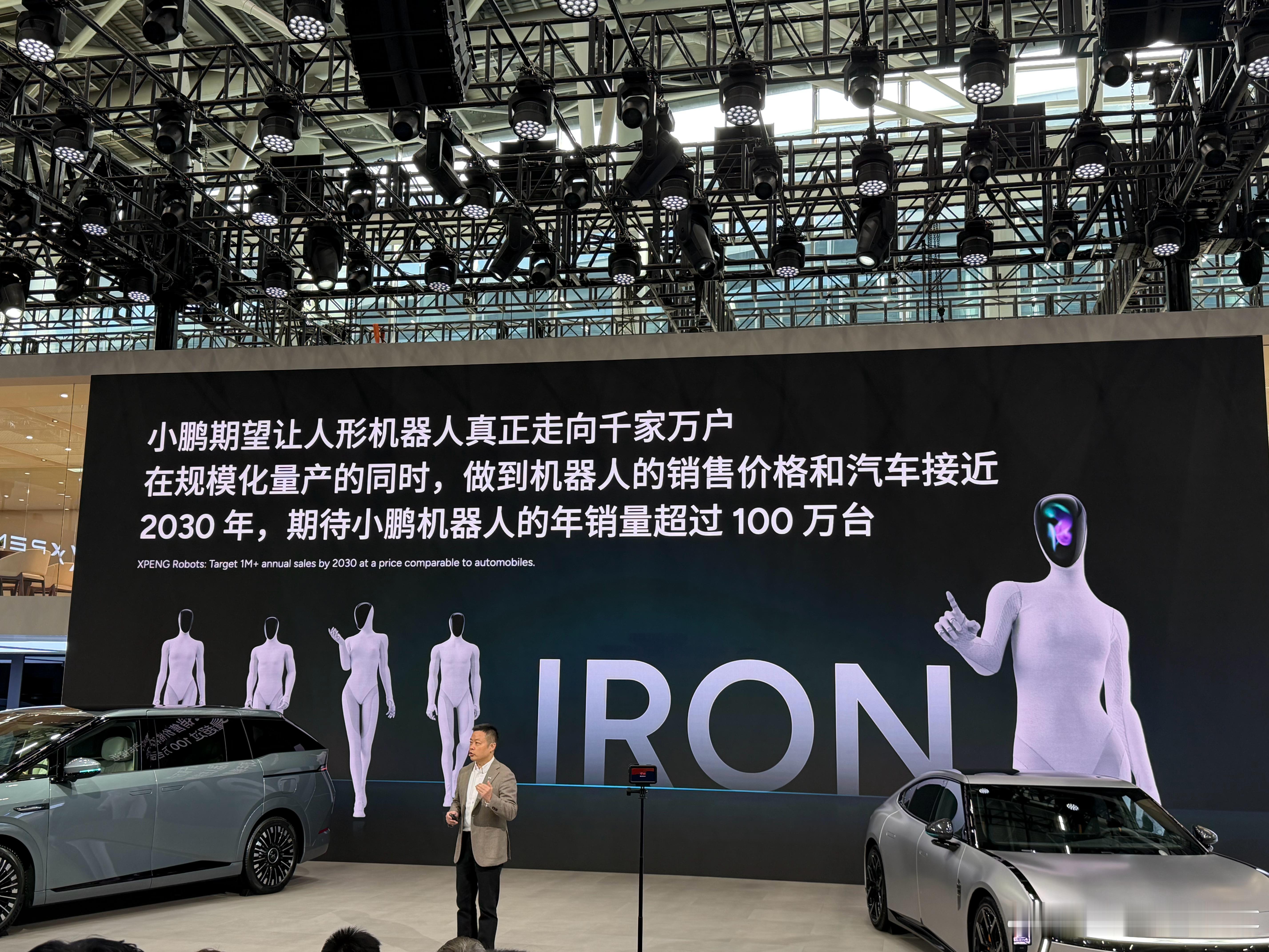 何小鹏说上一代的IRON的成本要100多万,他希望把机器人的销售价可以做到和汽车的售价接近。小鹏期望让人形机器人真正走向千家万户2030年期待小鹏机器人的年销量超过100万台
